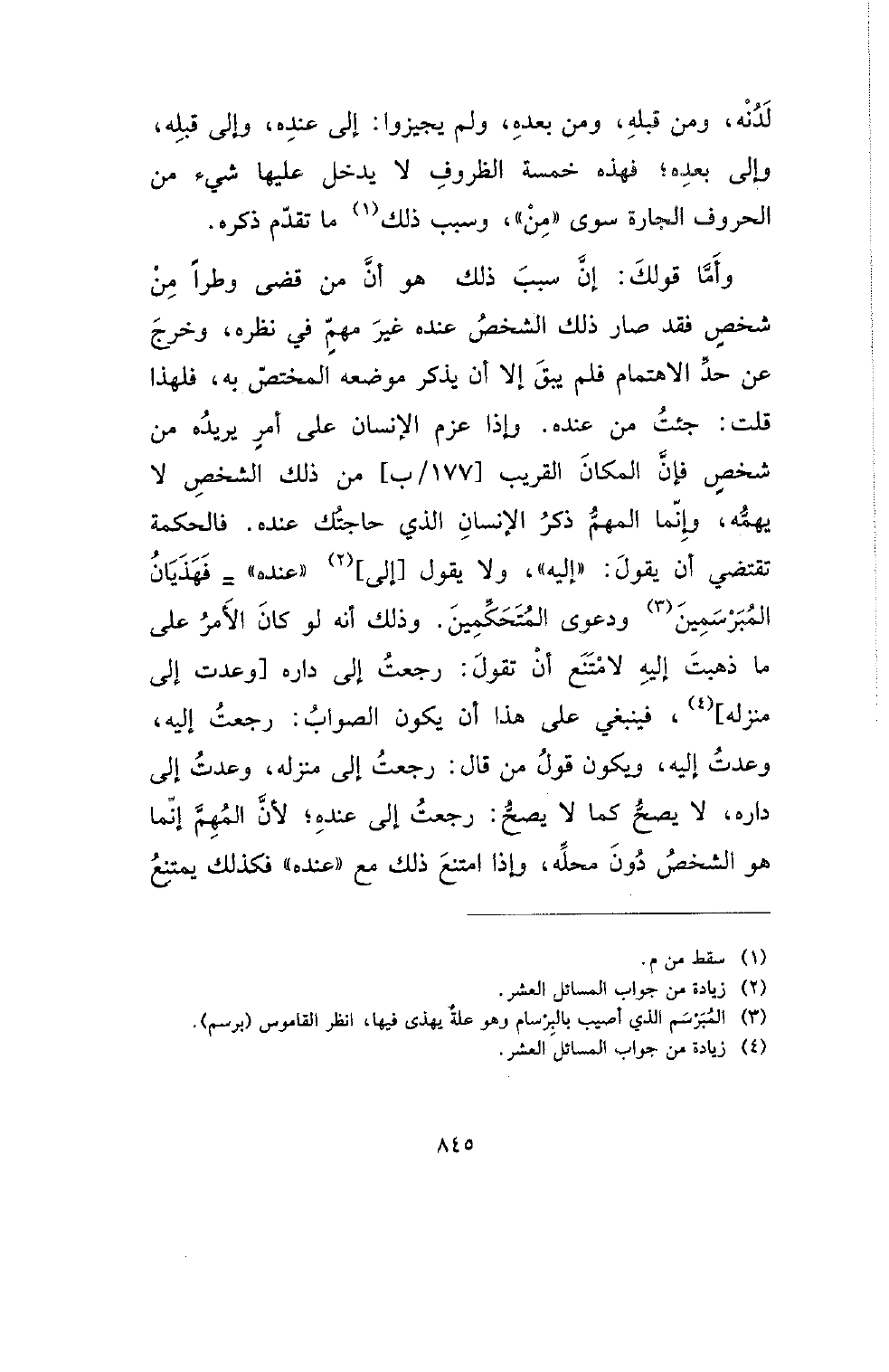 وأما قولك: إن سبب ذلك هو أن من قضى وطرًا من شخص فقد صار ذلك الشخص عنده غير مهم في نظره، وخرج عن حد الاهتمام فلم يبق إلا أن يذكر موضعه المختص به، فلهذا قلت: جئت من عنده. وإذا عزم الإنسان على أمر يريده من شخص فإن المكان القريب [177/ ب] من ذلك الشخص لا يهمه، وإنما المهم ذكر الإنسان الذي حاجتك عنده. فالحكمة تقتضي أن يقول: (إليه)، ولا يقول [إلى] (عنده) = فهذيان المبرسمين دعوى المتحكمين. وذلك أنه لو كان الأمر على ما ذهبت إليه لامتنع أن تقول: رجعت إلى داره [وعدت إلى منزله]، فينبغي على هذا أن يكون الصواب: رجعت إليه، وعدت إليه، ويكون قول من قال: رجعت إلى منزله، وعدت إلى داره، لا يصح كما لا يصح: رجعت إلى عنده؛ لأن المهم إنما هو الشخص دون محله، وإذا امتنع ذلك مع (عنده) فكذلك يمتنع