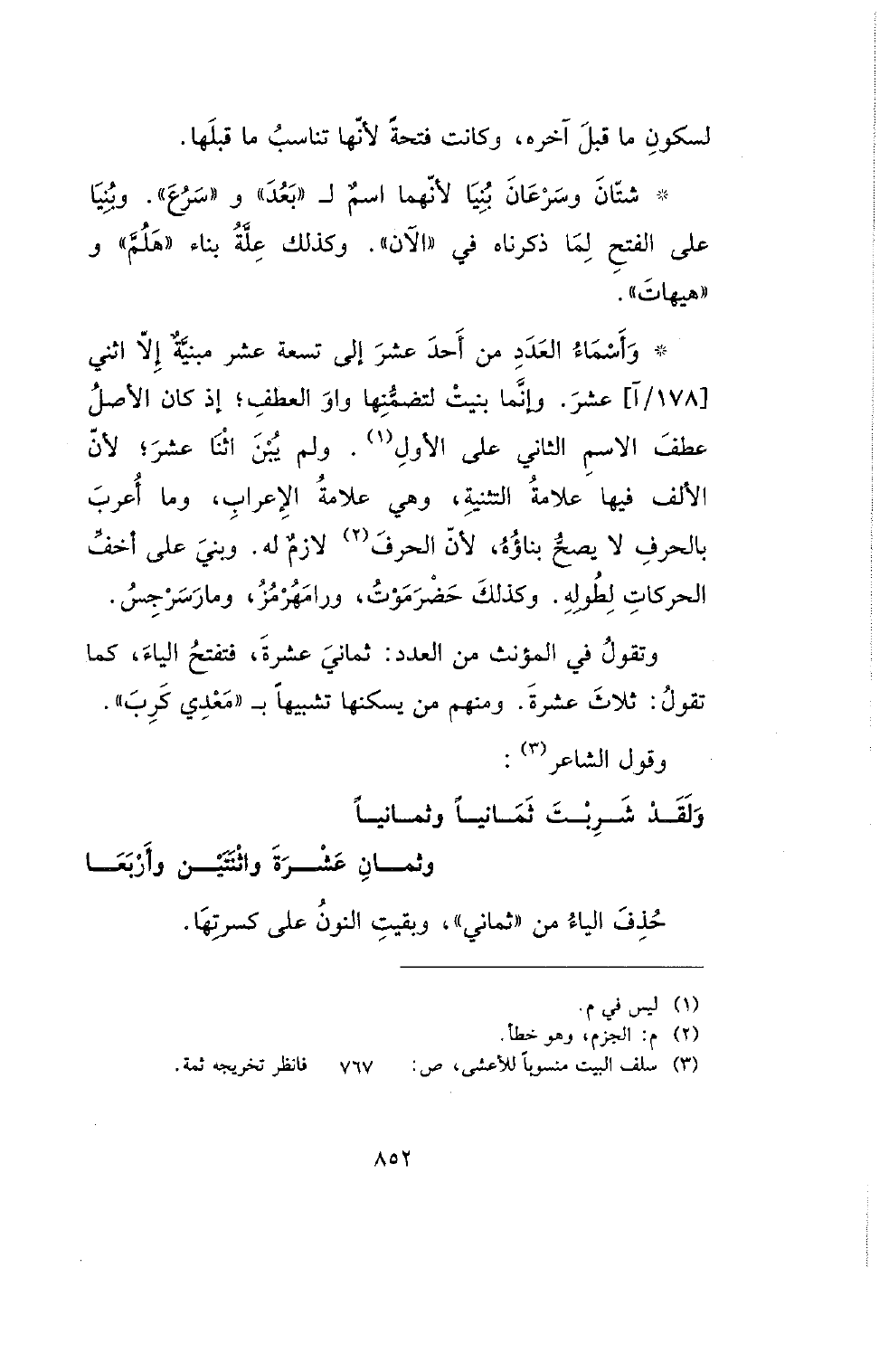*وأسماء العدد من أحد عشر إلى تسعة عشر مبنية إلا اثني [178/آ] عشر. وإنما بنيت لتضمنها واو العطف؛ إذا كان الأصل عطف الاسم الثاني على الأول. ولم يبن اثنا عشر؛ لأن الألف فيها علامة التثنية، وهي علامة الإعراب، وما أعرب بالحرف لا يصح بناؤه، لأن الحرف لازم له. وبني على اخف الحركات لطوله. وكذلك حضر موت، ورامهرمز، ومارسرجس.