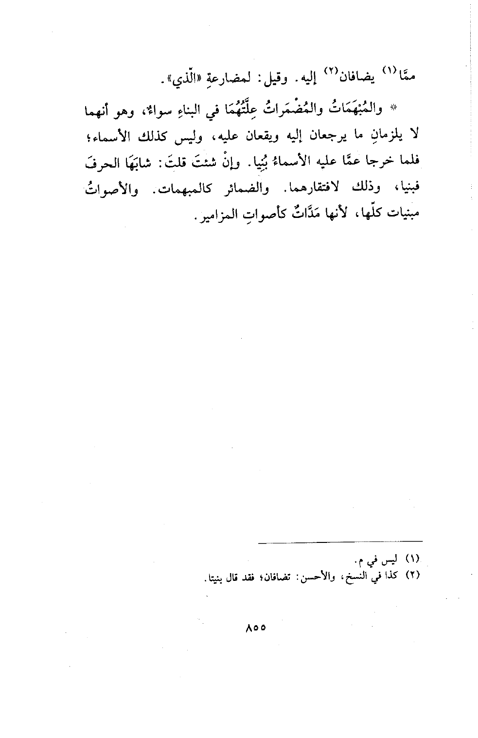 *والمبهمات والمضمرات علتهما في البناء سواء، وهو أنهما لا يلزمان ما يرجعان إليه ويقعان عليه، وليس كذلك الأسماء؛ فلما خرجا عما عليه الأسماء بنيا. وإن شئت قلت: شابها الحرف فبنيا، وذلك لافتقارهما. والضمائر كالمبهمات. والأصوات مبنيات كلها، لأنها مدات كأصوات المزامير.