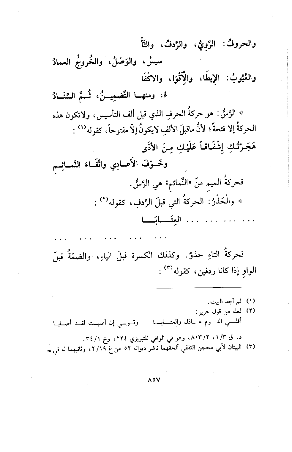 والحروف: الروي، والردف، والتأ .... سيس، والوصل، والخروج العماد