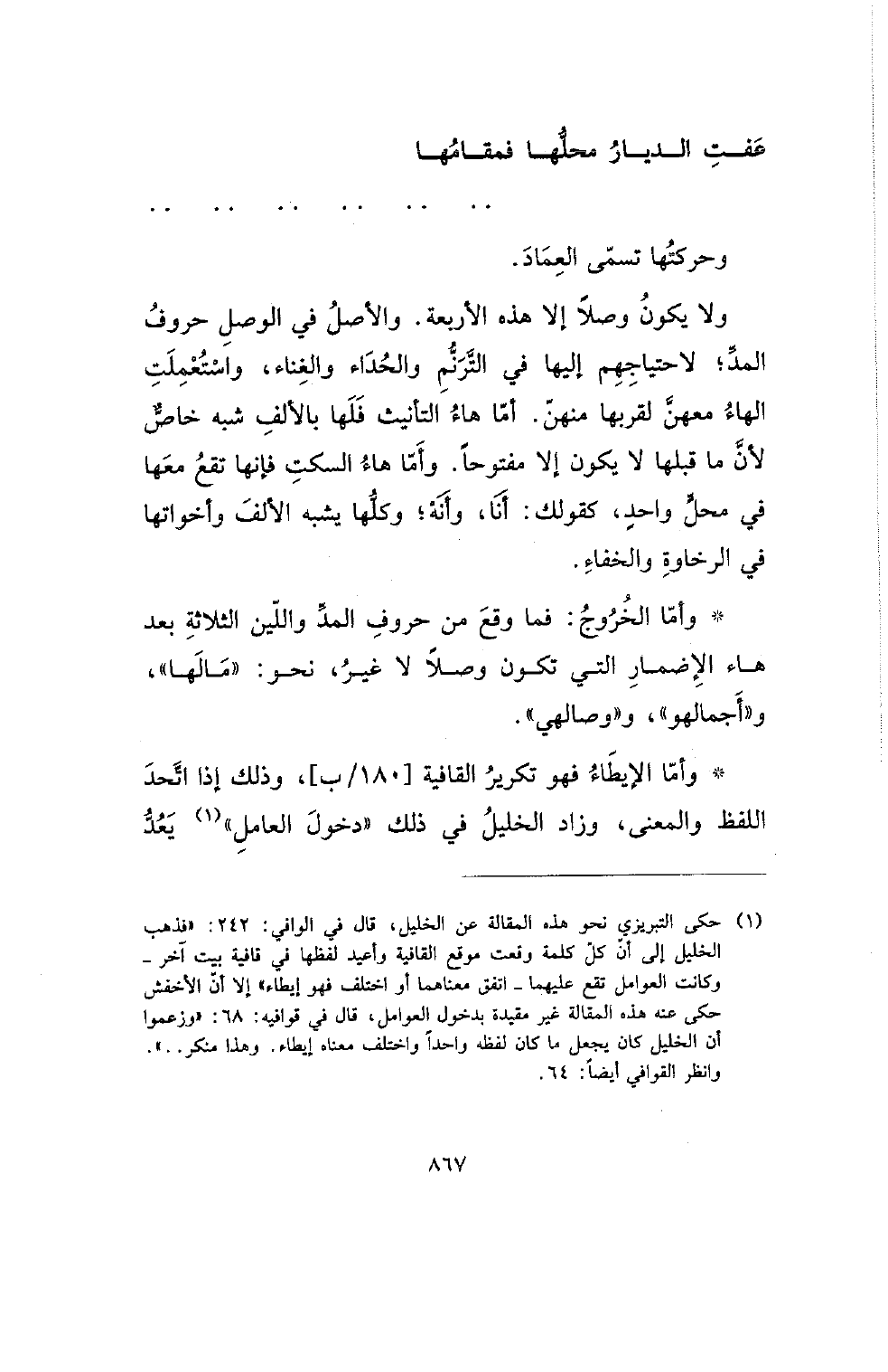 *وأما الإيطاء فهو تكرير القافية [180/ ب]، وذلك إذا تحد اللفظ والكعنى، وزاد الخليل في ذلك (دخول العامل) يعد