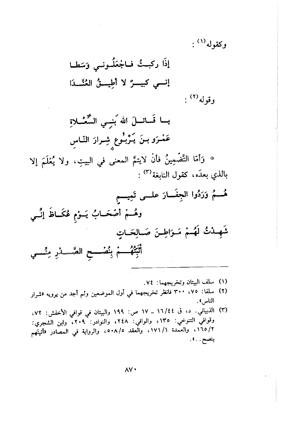 *وأما التضمين فأن لا يتم المعنى في البيت، ولا يعلم إلا بالذي بعده، كقول النابغة: