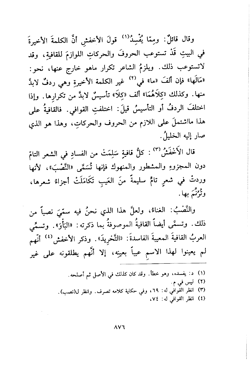 وقال قائل: ومما يفسد قول الأخفش أن الكلمة الأخيرة في البيت قد تستوعب الحروف والحركات اللوازم للقافية، وقد لا تستوعب ذلك. ويلزم الشاعر تكرار ما هو خارج عنها، نحو: (مالها) فإن ألف (ما) في غير الكلمة الأخيرة وهي ردف لابد منها. وكذلك (كلاهما) ألف (كلا) تأسيس لابد من تكرارها. وإذا اختلف الردف أو التأسيس قيل: اختلفت القوافي. فالقافية على هذا ما اشتمل على اللازم من الحروف والحركات، وهذا هو الذي صار إليه الخليل.