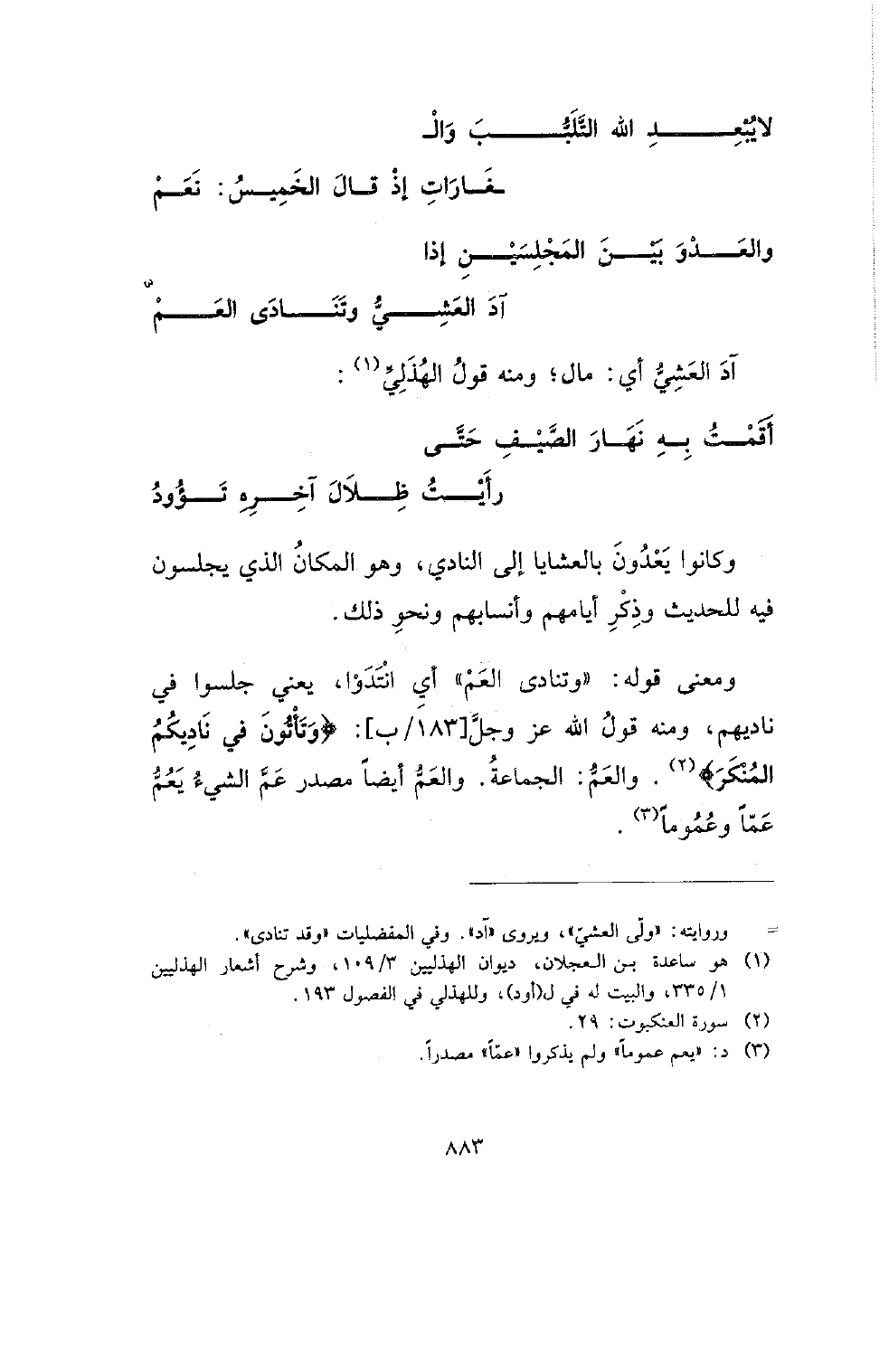 وكانوا يعدون بالعشايا إلى النادي، وهو المكان الذي يجلسون فيه للحديث وذكر أيامهم وأنسابهم ونحو ذلك.