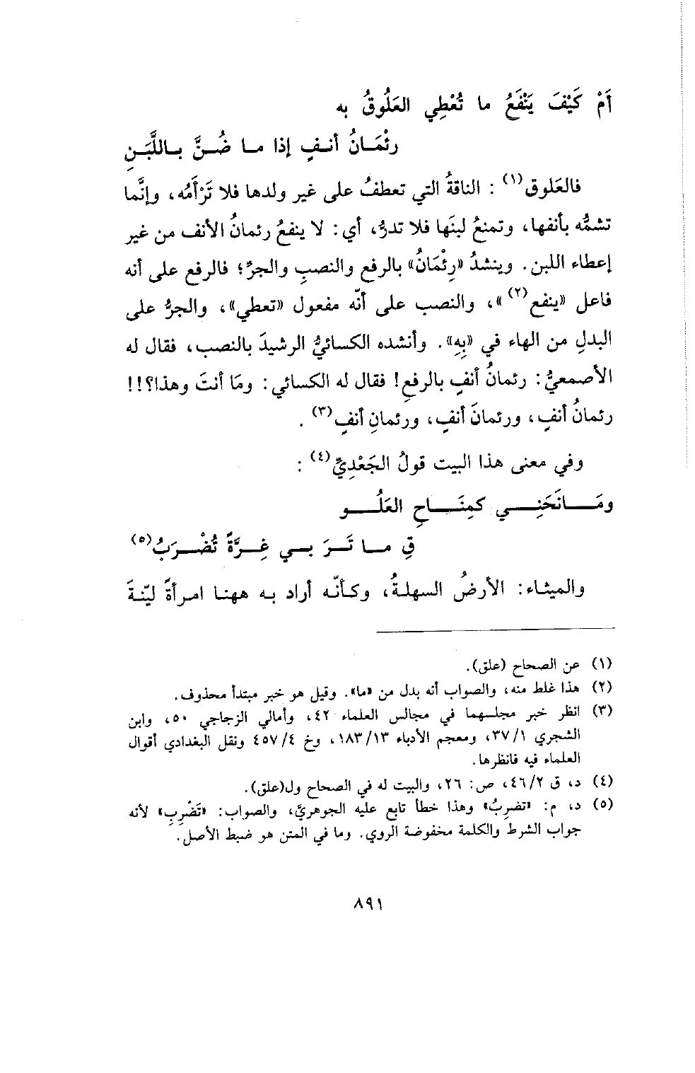 فالعلوق: الناقة التي تعطف على غير ولدها فلا ترأمه، وإنما تشه بأنفها، وتمنع لبنها فلا تدر، أي: لا ينفع رئمان الأنف من غير إعطاء اللبن. وينشد (رئمان) بالرفع والنصب والجر؛ فالرفع على أنه فاعل (ينفع)، والنصب على أنه مفعول (تعطي)، والجر على البدل من الهاء في (به). وأنشده الكسائي الرشيد بالنصب، فقال له الأصمعي: رئمان أنف بالرفع! فقال له الكسائي: وما أنت وهذا؟!! رئمانُ أنفٍ، ورئمانَ أنفٍ، ورئمانِ أنف.