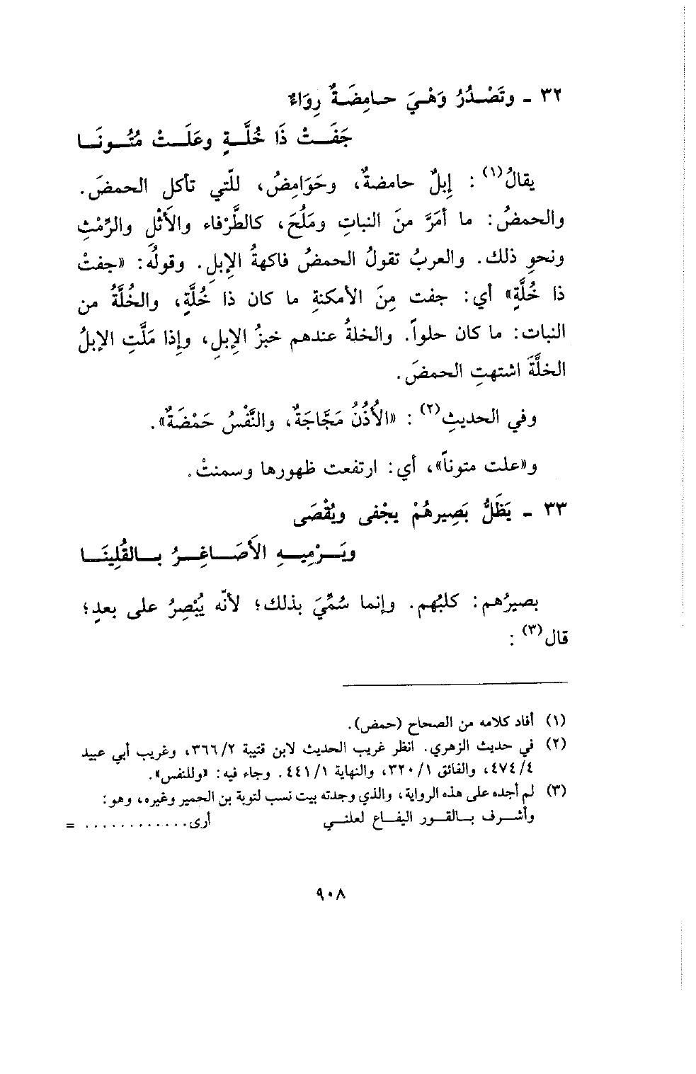 بقال: إبل حامضة، وحوامض، للتي تأكل الحمض. والحمض: ما أمر من النبات وملح، كالطرفاء والأثل والرمث ونحو ذلك. والعرب تقول الحمض فاكهة الإبل. وقوله: (جفت ذا خل) أي: جفت من الأمكنة ما كان ذا خلة، والخلة من النبات: ما كان حلوا. والخلة عندهم خبز الإبل، وإذا ملت الإبل الخلة اشتهت الحمض.
