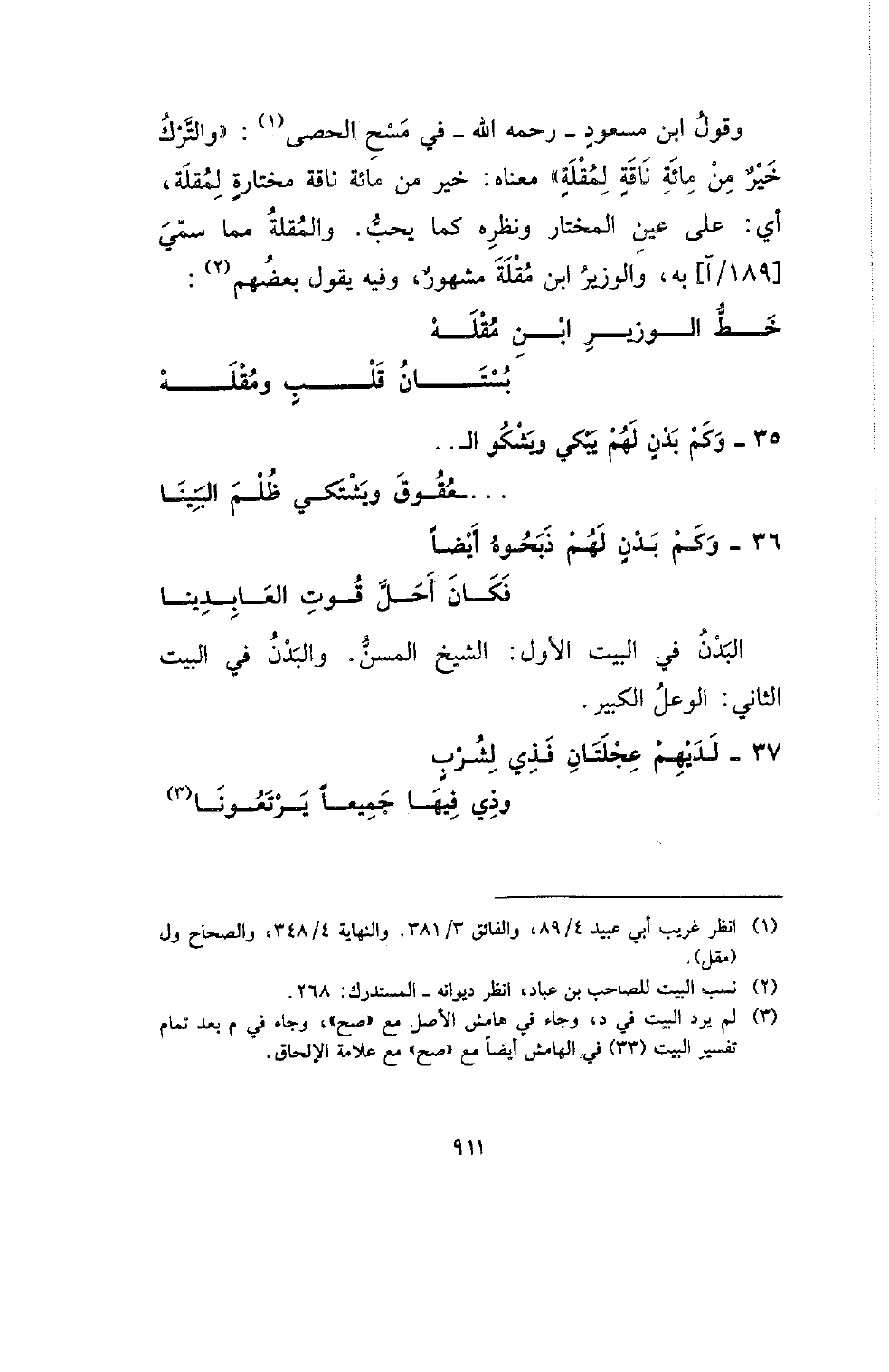وقول ابن مسعود- رحمه الله- في مسح الحصى: (والترك خير من مائة ناقة لمقلة) معناه: خير من مائة ناقة مختارة لمقلة، أي: على عين المختار ونظره كما يحب. والمقلة مما سمي به، والوزير ابن مقلة مشهور، وفيه يقول بعضهم: