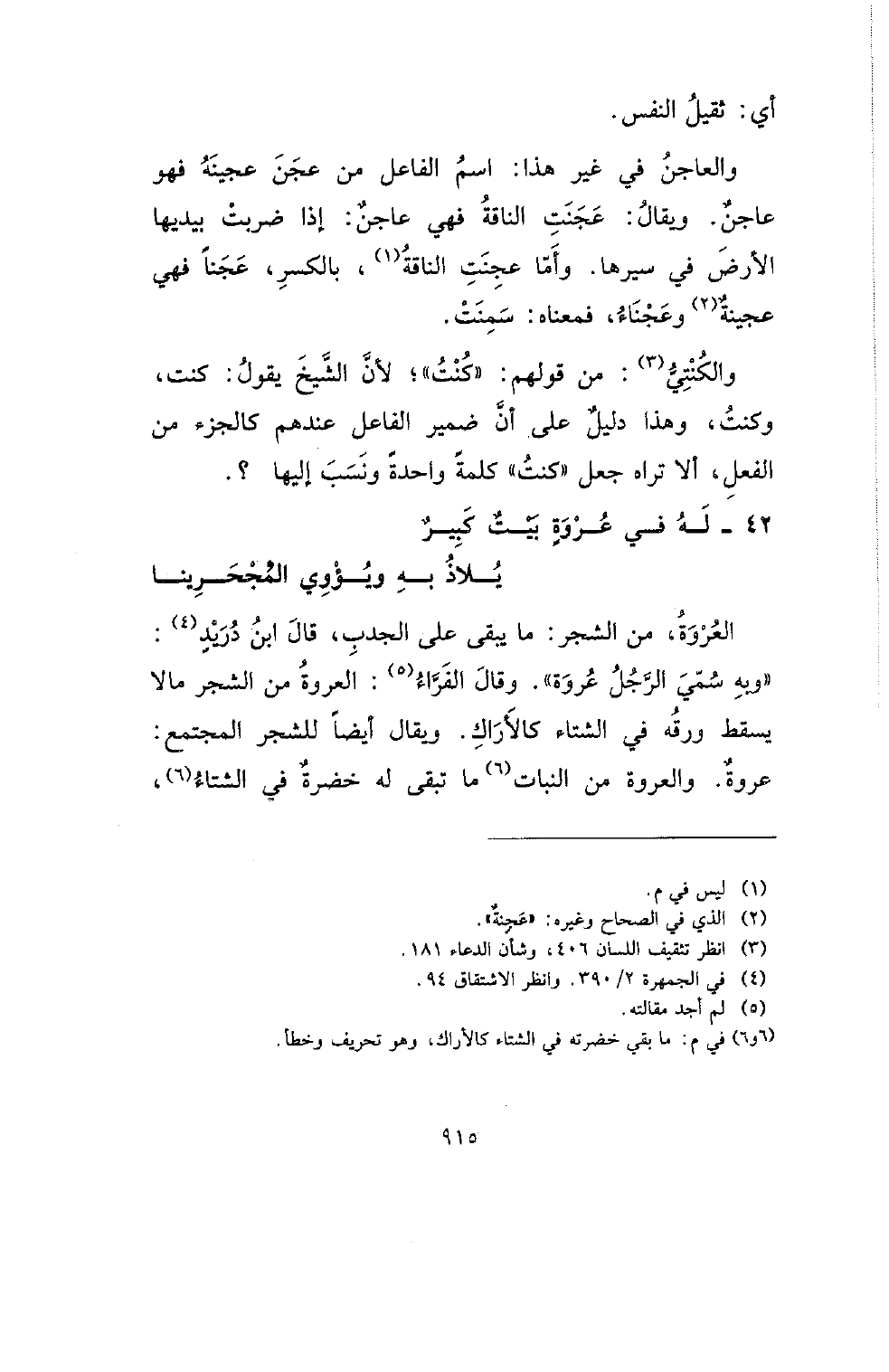 العروة، من الشجر: ما يبقى على الجدب، قال ابن دريد: (وبه سمى الرجل عروة). وقال الفراء: العروة من الشجر مالا يسقط ورقة في الشتاء كالأراك. ويقال أيضا للشجر المجتمع: عروة. والعروة من النبات ما تبقى له خضرة في الشتاء،