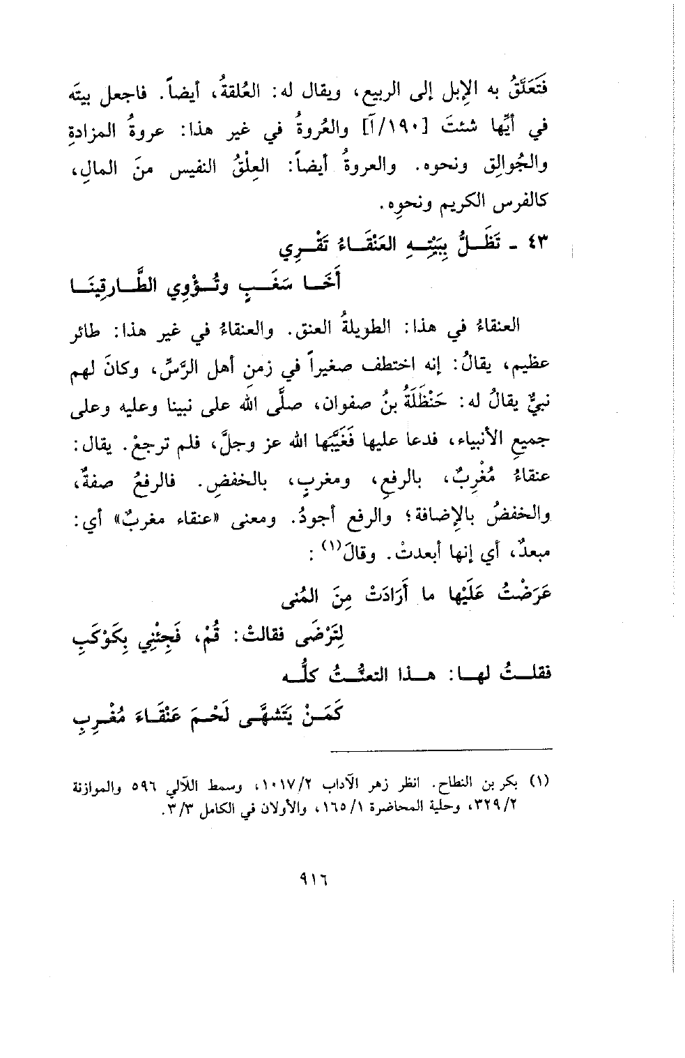 العنقاء في هذا: الطويلة العنق. والعنقاء في غير هذا: طائر عظيم، يقال: إنه اختطف صغيرا في زمن أهل الرس، وكان لهم نبي يقال له: حنظلة بن صفوان، صلى الله على نبينا وعليه وعلى جميع الأنبياء، فدعا عليها فغيبها الله عز وجل، فلم ترجع. يقال: عنقاء مغرب، بالرفع، ومغرب، بالخفض. فالرفع صفة، والخفض بالإضافة، والرف أجود. ومعنى (عنقاء مغرب) أي: مبعد، أي إنها أبعدت. وقال: