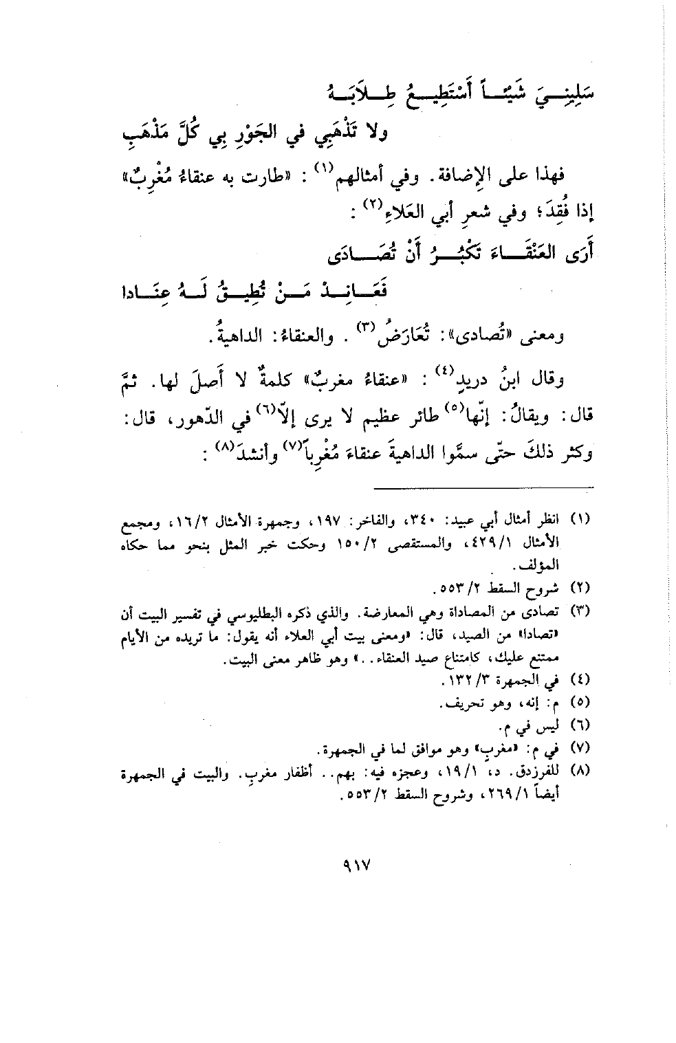 وقال ابن دريد: (عنقاء مغرب) كلمة لا أصل لها. ثم قال: ويقال: إنها طائر عظيم لا يرى إلا في الدهور، قال: وكثر ذلك حتى سموا الداهية عنقاء مغربا وأنشد:
