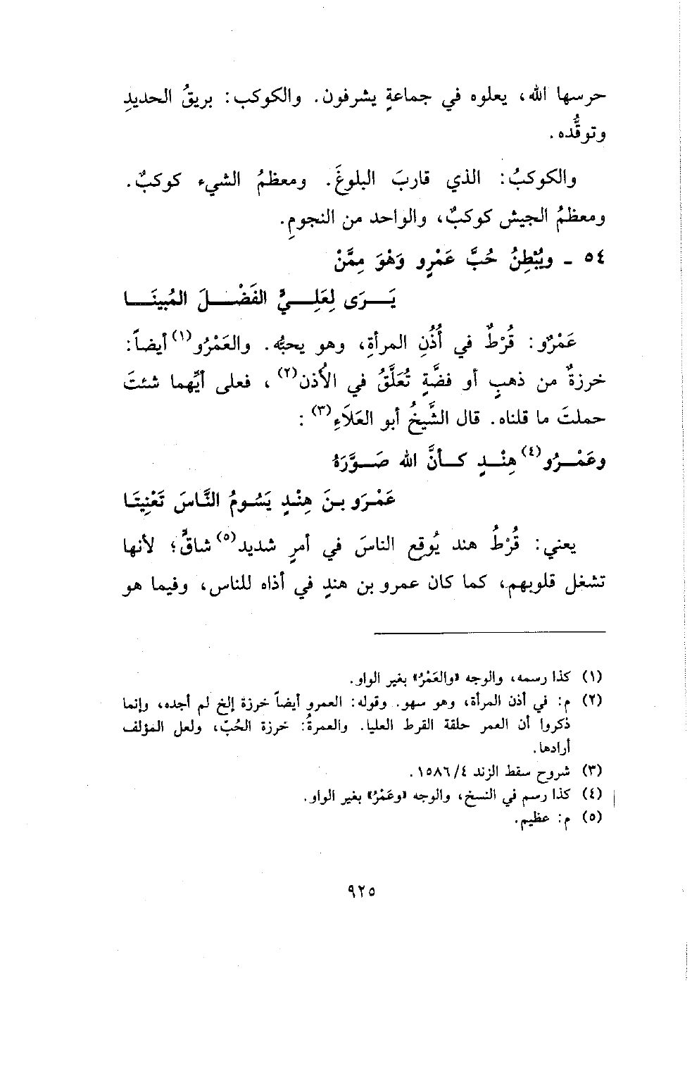 عمرو: قرط في أذن المرأة، وهو يحبه. والعمرو أيضا: خرزة من ذهب أو فضى تعلق في الأذن، فعلى أيهما شئت حملت ما قلناه. قال الشيخ أبو العلاء: