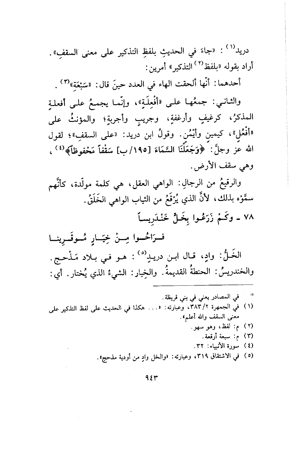 والثاني: جمعها على (أفعله)، وإنما يجمع على أفعلة المذكر، كرغيف وأرغفة، وجريب وأجربة، والمؤنث على (أفعل)، كيمين وأيمن. وقول ابن دريد: (على السقف)، لقول الله عز وجل: {وجعلنا السماء سقفا محفوظا}، وهي سقف الأرض.