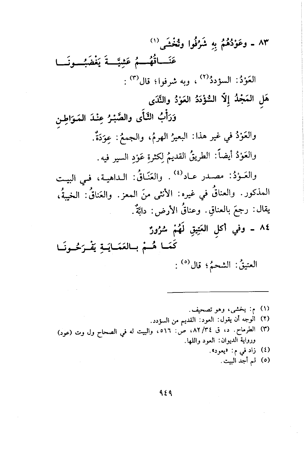 والعود: مصدر عاد. والعناق: الداهية، في البيت المذكور. والعناق في غيره: الأنثى من المعز. والعناق: الخيبة، يقال: رجع بالعناق. وعناق الأرض: دابة.