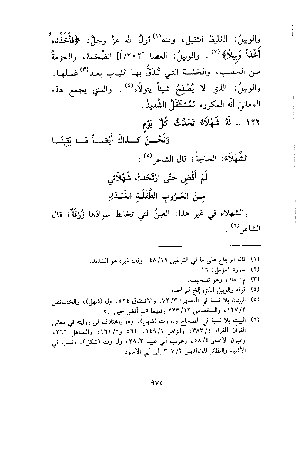 والوبيل: الغليظ الثقيل، ومنه قول الله عز وجل: {فأخذناه أخذا وبيلا}. والوبيل: العصا [202/آ] الضخمة، والحزمة من الحطب، والخشبة التي تدق بها الثياب بعد غسلها. والوبيل: الذي لا يصلح شيئا يتولاه. والذي يجمع هذه المعاني أنه المكروه المستثقل الشديد.