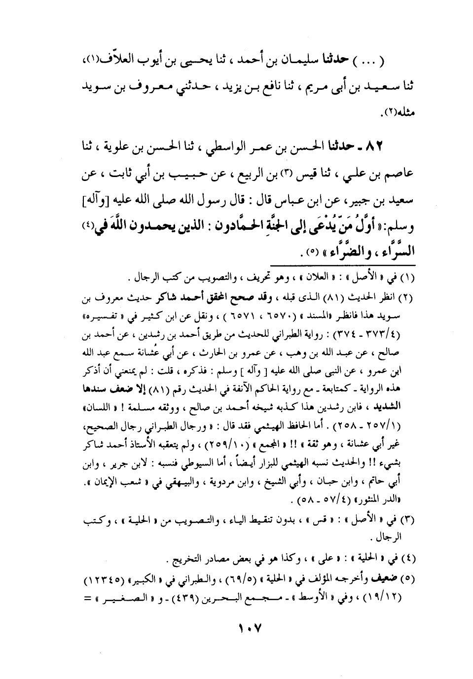 82 - حَدَّثَنَا الْحَسَنُ بْنُ عُمَرَ الْوَاسِطِيُّ، ثنا الْحَسَنُ بْنُ عَلُّويَةَ، ثنا عَاصِمُ بْنُ عَلِيٍّ، ثنا قَيْسُ بْنُ الرَّبِيعِ، عَنْ حَبِيبِ بْنِ أَبِي ثَابِتٍ، عَنْ سَعِيدِ بْنِ جُبَيْرٍ , عَنِ ابْنِ عَبَّاسٍ، قَالَ: قَالَ رَسُولُ اللَّهِ صَلَّى اللَّهُ عَلَيْهِ وَآلِهِ وَسَلَّمَ:، §أَوَّلُ مَنْ يُدْعَى إِلَى الْجَنَّةِ الْحَمَّادُونَ: الَّذِينَ يَحْمَدُونَ اللَّهَ فِي السَّرَّاءِ وَالضَّرَّاءِ -[108]- رَوَاهُ الْمَسْعُودِيُّ وَشُعْبَةُ، عَنْ حَبِيبٍ مِثْلَهُ