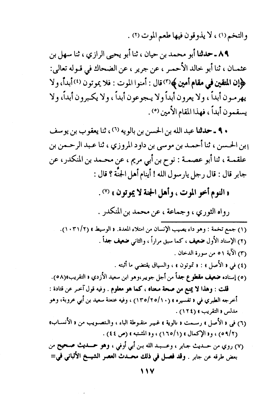 89 - حَدَّثَنَا أَبُو مُحَمَّدِ بْنُ حَيَّانَ، ثنا أَبُو يَحْيَى الرَّازِيُّ، ثنا سَهْلُ بْنُ عُثْمَانَ، ثنا أَبُو خَالِدٍ الْأَحْمَرُ، عَنْ جَرِيرٍ , عَنِ الضَّحَّاكِ، فِي قَوْلِهِ تَعَالَى {إِنَّ الْمُتَّقِينَ فِي مَقَامٍ أَمِينٍ} [الدخان: 51] قَالَ: " §أَمِنُوا الْمَوْتَ فَلَا يَمُوتُونَ أَبَدًا، وَلَا يَهْرَمُونَ أَبَدًا، وَلَا يَعْرَوْنَ أَبَدًا، وَلَا يَجُوعُونَ أَبَدًا، وَلَا يَكْبَرُونَ أَبَدًا، وَلَا يَسْقَمُونَ أَبَدًا، فَهَذَا الْمَقَامُ الْأَمِينُ