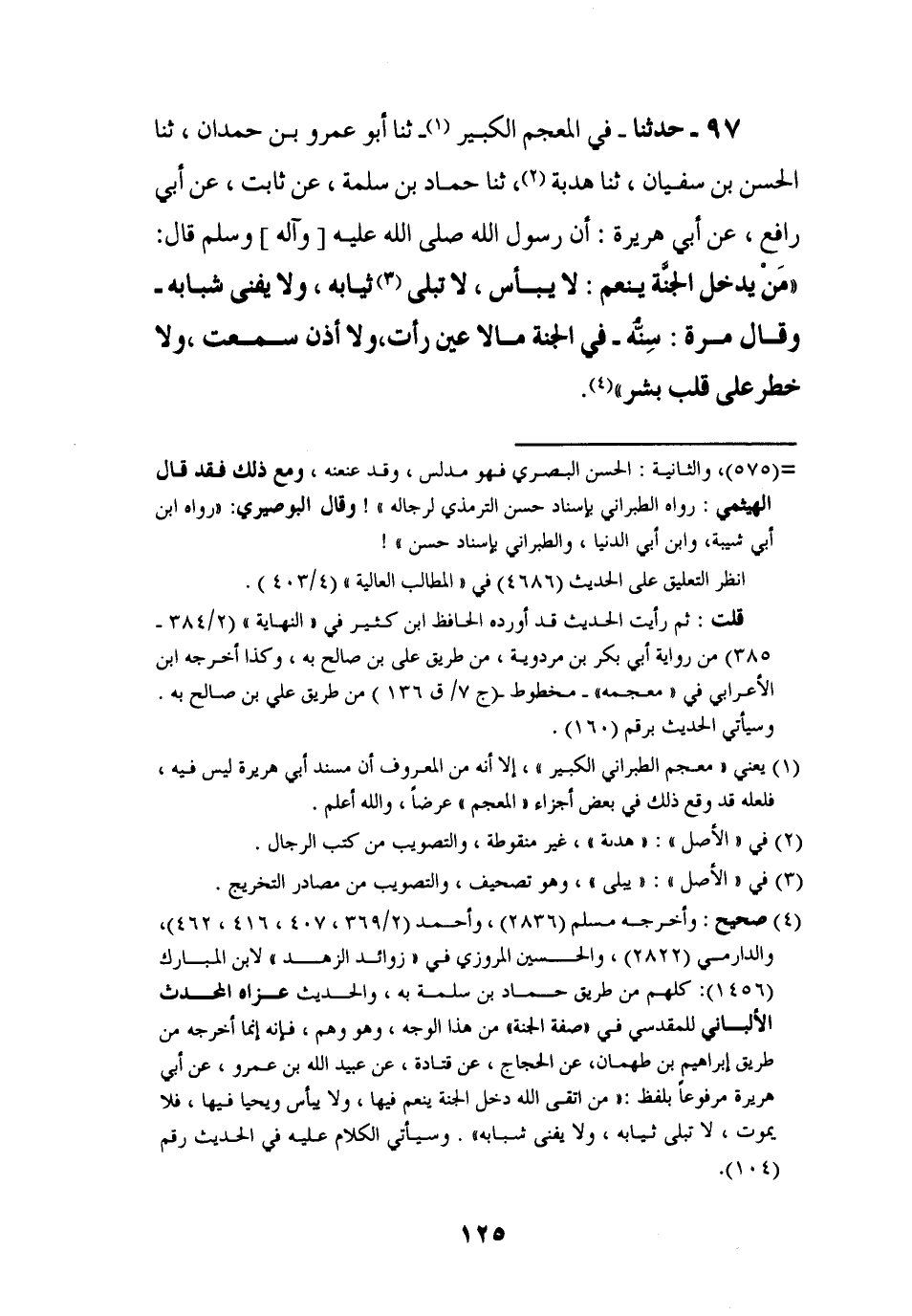 97 - حَدَّثَنَا فِي الْمُعْجَمِ الْكَبِيرِ، ثنا أَبُو عَمْرِو بْنُ حَمْدَانَ، ثنا الْحَسَنُ بْنُ سُفْيَانَ، ثنا هُدْبَةُ، ثنا حَمَّادُ بْنُ سَلَمَةَ، عَنْ ثَابِتٍ، عَنْ أَبِي رَافِعٍ , عَنْ أَبِي هُرَيْرَةَ، أَنَّ رَسُولَ اللَّهِ صَلَّى اللَّهُ عَلَيْهِ وَآلِهِ وَسَلَّمَ قَالَ: " §مَنْ يَدْخُلُ الْجَنَّةَ يَنْعَمُ لَا يَبْأَسُ، لَا تَبْلَى ثِيَابُهُ وَلَا يَفْنَى شَبَابُهُ، وَقَالَ مَرَّةً: سِنُّهُ، فِي الْجَنَّةِ مَا لَا عَيْنٌ رَأَتْ، وَلَا أُذُنٌ سَمِعَتْ، وَلَا خَطَرَ عَلَى قَلْبِ بَشَرٍ
