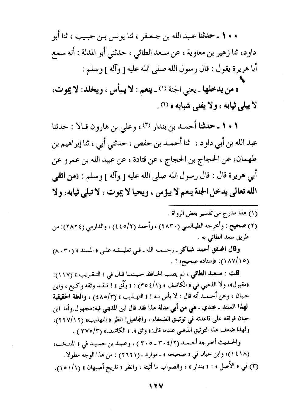 100 - حَدَّثَنَا عَبْدُ اللَّهِ بْنُ جَعْفَرٍ، ثنا يُونُسُ بْنُ حَبِيبٍ، ثنا أَبُو دَاوُدَ، ثنا زُهَيْرُ بْنُ مُعَاوِيَةَ، عَنْ سَعْدٍ الطَّائِيِّ، حَدَّثَنِي أَبُو الْمُدِلَّةِ، أَنَّهُ سَمِعَ أَبَا هُرَيْرَةَ، يَقُولُ: قَالَ رَسُولُ اللَّهِ صَلَّى اللَّهُ عَلَيْهِ وَآلِهِ وَسَلَّمَ:، §مَنْ يَدْخُلُهَا، يَعْنِي الْجَنَّةَ، يَنْعَمُ لَا يَبْأَسُ، وَيَخْلُدُ لَا يَمُوتُ، لَا يَبْلَى ثِيَابُهُ وَلَا يَفْنَى شَبَابُهُ
