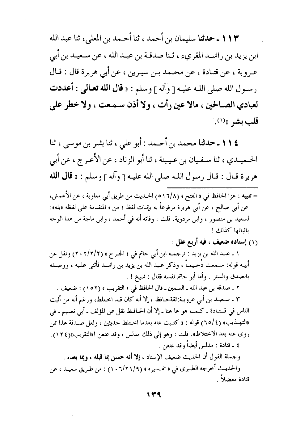113 - حَدَّثَنَا سُلَيْمَانُ بْنُ أَحْمَدَ، ثنا أَحْمَدُ بْنُ الْمُعَلَّى، ثنا عَبْدُ اللَّهِ بْنُ يَزِيدَ بْنِ رَاشِدٍ الْمُقْرِئُ، ثنا صَدَقَةُ بْنُ عَبْدِ اللَّهِ، عَنْ سَعِيدِ بْنِ أَبِي عَرُوبَةَ، عَنْ قَتَادَةَ، عَنْ مُحَمَّدِ بْنِ سِيرِينَ , عَنْ أَبِي هُرَيْرَةَ، قَالَ: قَالَ رَسُولُ اللَّهِ صَلَّى اللَّهُ عَلَيْهِ وَآلِهِ وَسَلَّمَ: قَالَ اللَّهُ تَعَالَى: §أَعْدَدْتُ لِعِبَادِيَ الصَّالِحِينَ مَا لَا عَيْنٌ رَأَتْ، وَلَا أُذُنٌ سَمِعَتْ، وَلَا خَطَرَ عَلَى قَلْبِ بَشَرٍ