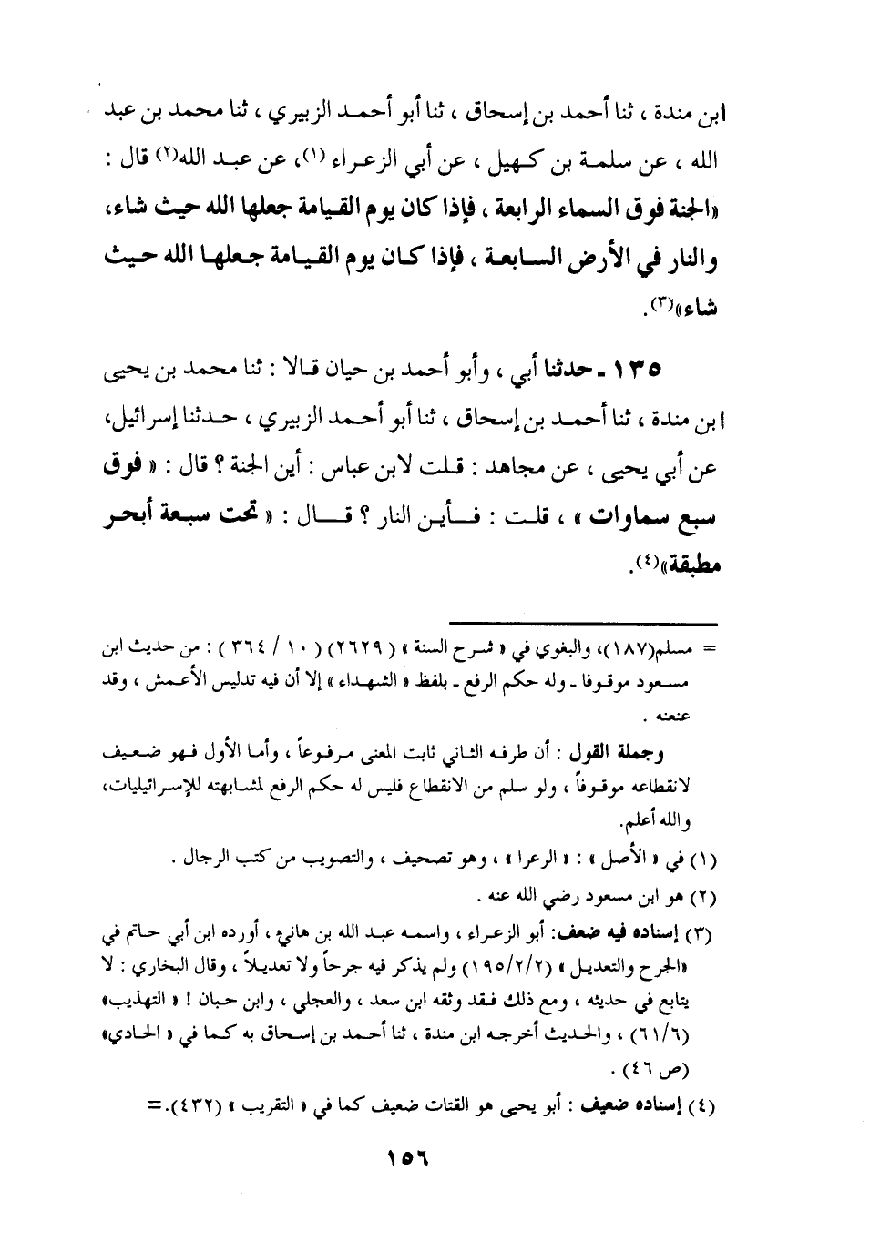 135 - حَدَّثَنَا أَبِي، وَأَبُو أَحْمَدَ بْنُ حَيَّانَ قَالَا: ثنا مُحَمَّدُ بْنُ يَحْيَى بْنِ مَنْدَةَ، ثنا أَحْمَدُ بْنُ إِسْحَاقَ، ثنا أَبُو أَحْمَدَ الزُّبَيْرِيُّ، حَدَّثَنَا إِسْرَائِيلُ، عَنْ أَبِي يَحْيَى عَنْ مُجَاهِدٍ: قُلْتُ لِابْنِ عَبَّاسٍ:، §أَيْنَ الْجَنَّةُ؟ قَالَ: فَوْقَ سَبْعِ سَمَاوَاتٍ، قُلْتُ: فَأَيْنَ النَّارُ؟ قَالَ: تَحْتَ سَبْعِ أَبْحُرٍ مُطْبَقَةٍ