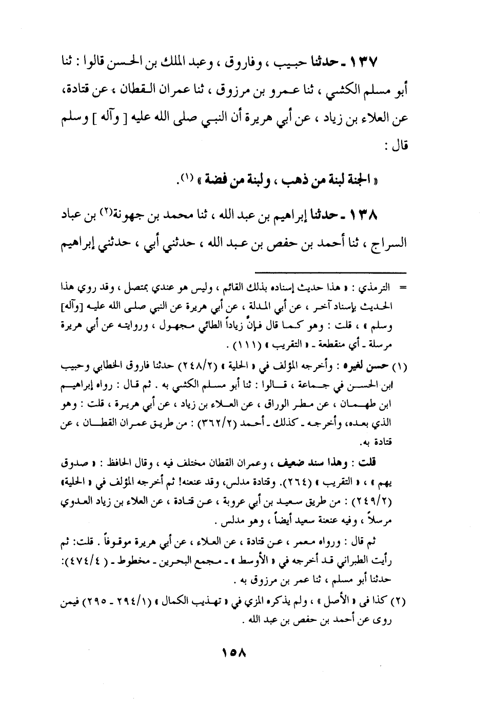 137 - حَدَّثَنَا حَبِيبٌ، وَفَارُوقٌ، وَعَبْدُ الْمَلِكِ بْنُ الْحَسَنِ، قَالُوا: ثنا أَبُو مُسْلِمٍ الْكَشِّيُّ، ثنا عَمْرُو بْنُ مَرْزُوقٍ، ثنا عِمْرَانُ بْنُ الْقَطَّانِ، عَنْ قَتَادَةَ، عَنِ الْعَلَاءِ بْنِ زِيَادٍ , عَنْ أَبِي هُرَيْرَةَ، أَنَّ النَّبِيَّ صَلَّى اللَّهُ عَلَيْهِ وَآلِهِ وَسَلَّمَ قَالَ: §" الْجَنَّةُ لَبِنَةٌ مِنْ ذَهَبٍ وَلَبِنَةٌ مِنْ فِضَّةٍ