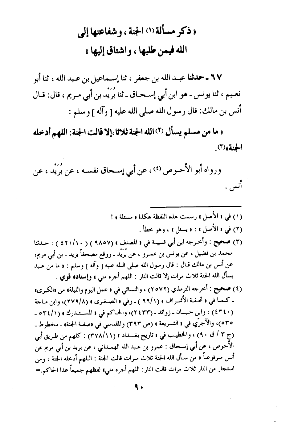 67 - حَدَّثَنَا عَبْدُ اللَّهِ بْنُ جَعْفَرٍ، ثنا إِسْمَاعِيلُ بْنُ عَبْدِ اللَّهِ، ثنا أَبُو نُعَيْمٍ، ثنا يُونُسُ هُوَ ابْنُ أَبِي إِسْحَاقَ، ثنا يَزِيدُ بْنُ أَبِي مَرْيَمَ قَالَ: قَالَ أَنَسُ بْنُ مَالِكٍ: قَالَ رَسُولُ اللَّهِ صَلَّى اللَّهُ عَلَيْهِ وَآلِهِ وَسَلَّمَ: §" مَا مِنْ مُسْلِمٍ يَسْأَلُ اللَّهَ الْجَنَّةَ ثَلَاثًا إِلَّا قَالَتِ الْجَنَّةُ: اللَّهُمَّ أَدْخِلْهُ الْجَنَّةَ وَرَوَاهُ أَبُو الْأَحْوَصِ، عَنْ أَبِي إِسْحَاقَ نَفْسِهِ، عَنْ يَزِيدَ، عَنْ أَنَسٍ