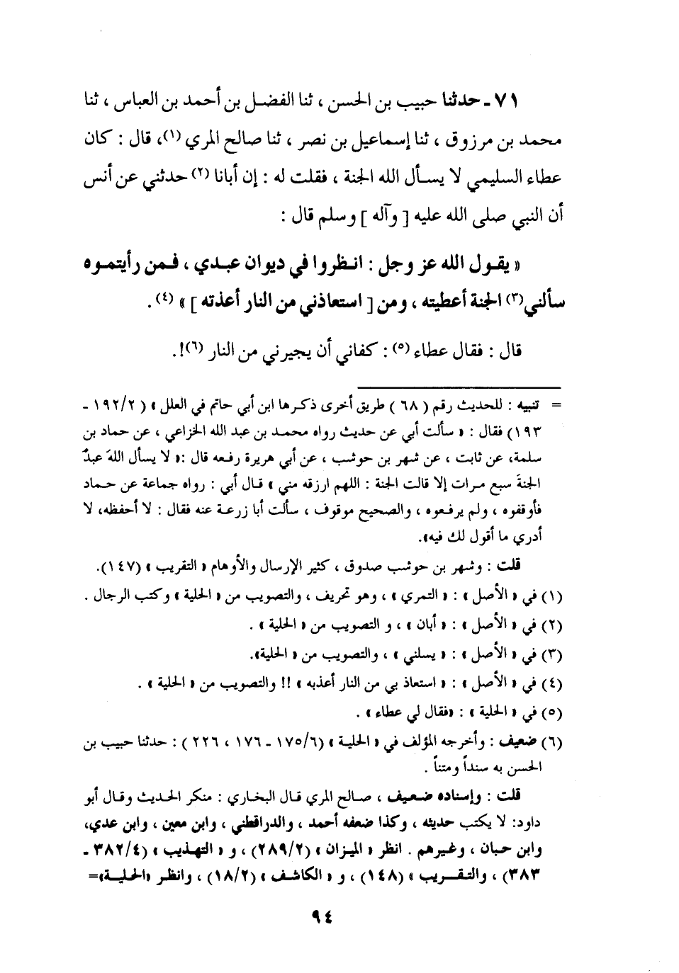 71 - حَدَّثَنَا حَبِيبُ بْنُ الْحَسَنِ، ثنا الْفَضْلُ بْنُ أَحْمَدَ بْنِ الْعَبَّاسِ، ثنا مُحَمَّدُ بْنُ مَرْزُوقٍ، ثنا إِسْمَاعِيلُ بْنُ نَصْرٍ، ثنا صَالِحٌ الْمُرِّيُّ، قَالَ: كَانَ عَطَاءٌ السُّلَيْمِيُّ لَا يَسْأَلُ اللَّهَ الْجَنَّةَ، فَقُلْتُ لَهُ: إِنَّ أَبَانَا حَدَّثَنِي عَنْ أَنَسٍ أَنَّ النَّبِيَّ صَلَّى اللَّهُ عَلَيْهِ وَآلِهِ وَسَلَّمَ قَالَ: يَقُولُ اللَّهُ عَزَّ وَجَلَّ: §انْظُرُوا فِي دِيوَانِ عَبْدِي، فَمَنْ رَأَيْتُمُوهُ سَأَلَنِي الْجَنَّةَ أَعْطَيْتُهُ، وَمَنِ اسْتَعَاذَنِي مِنَ النَّارِ أَعَذْتُهُ قَالَ: فَقَالَ عَطَاءٌ: كَفَانِي أَنْ يُجِيرَنِي مِنَ النَّارِ