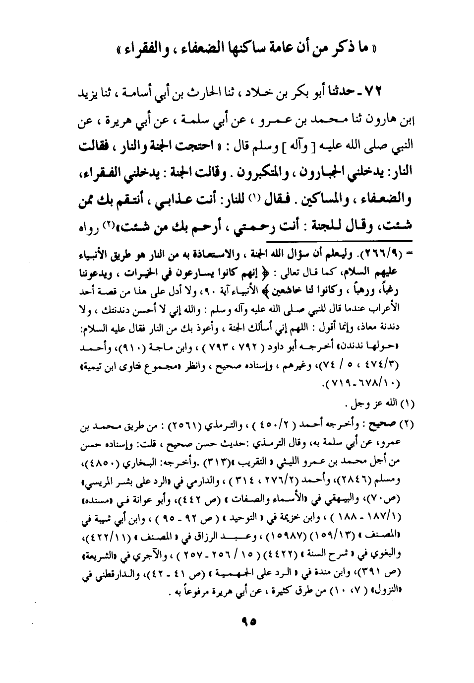 72 - حَدَّثَنَا أَبُو بَكْرِ بْنُ خَلَّادٍ، ثنا الْحَارِثُ بْنُ أَبِي أُسَامَةَ، ثنا يَزِيدُ بْنُ هَارُونَ، ثنا مُحَمَّدُ بْنُ عَمْرٍو، عَنْ أَبِي سَلَمَةَ , عَنْ أَبِي هُرَيْرَةَ، عَنِ النَّبِيِّ صَلَّى اللَّهُ عَلَيْهِ وَآلِهِ وَسَلَّمَ قَالَ: " §احْتَجَّتِ الْجَنَّةُ وَالنَّارُ، فَقَالَتِ النَّارُ: يَدْخُلُنِي الْجَبَّارُونَ، وَالْمُتَكَبِّرُونَ. وَقَالَتِ الْجَنَّةُ: يَدْخُلُنِي الْفُقَرَاءُ، وَالضُّعَفَاءُ، وَالْمَسَاكِينُ. فَقَالَ لِلنَّارِ: أَنْتِ عَذَابِي، أَنْتَقِمُ بِكِ مِمَّنْ شِئْتُ، وَقَالَ لِلْجَنَّةِ: أَنْتِ رَحْمَتِي، أَرْحَمُ بِكِ مَنْ شِئْتُ رَوَاهُ -[96]- الْأَعْرَجُ، وَعَوْنُ بْنُ عَبْدِ اللَّهِ