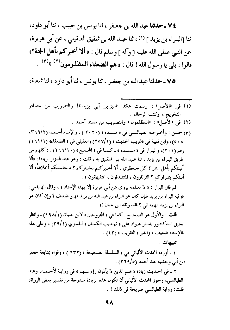 74 - حَدَّثَنَا عَبْدُ اللَّهِ بْنُ جَعْفَرٍ، ثنا يُونُسُ بْنُ حَبِيبٍ، ثنا أَبُو دَاوُدَ، ثنا الْبَرَاءُ بْنُ يَزِيدَ، ثنا عَبْدُ اللَّهِ بْنُ شَقِيقٍ الْعُقَيْلِيُّ , عَنْ أَبِي هُرَيْرَةَ، عَنِ النَّبِيِّ صَلَّى اللَّهُ عَلَيْهِ وَآلِهِ وَسَلَّمَ قَالَ: " §أَلَا أُخْبِرُكُمْ بِأَهْلِ الْجَنَّةِ؟، قَالُوا: بَلَى يَا رَسُولَ اللَّهِ. قَالَ: هُمُ الضُّعَفَاءُ الْمَظْلُومُونَ