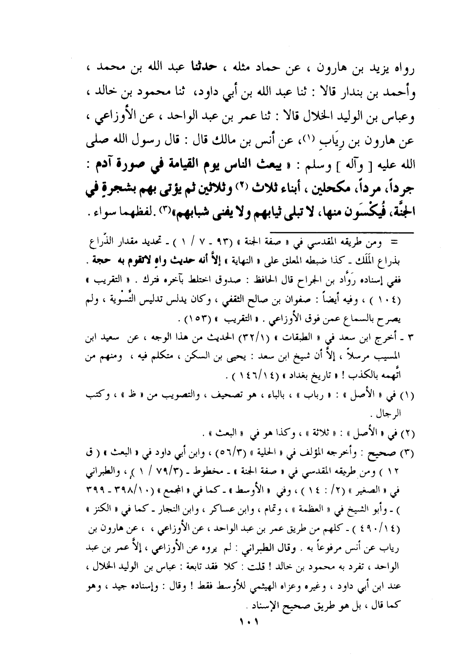 حَدَّثَنَا عَبْدُ اللَّهِ بْنُ مُحَمَّدٍ، وَأَحْمَدُ بْنُ بُنْدَارٍ قَالَا: ثنا عَبْدُ اللَّهِ بْنُ أَبِي دَاوُدَ، ثنا مَحْمُودُ بْنُ خَالِدٍ، وَعَبَّاسُ بْنُ الْوَلِيدِ الْخَلَّالُ قَالَا: ثنا عُمَرُ بْنُ عَبْدِ الْوَاحِدِ، عَنِ الْأَوْزَاعِيِّ، عَنْ هَارُونَ بْنِ رِيَابٍ , عَنْ أَنَسِ بْنِ مَالِكٍ قَالَ: قَالَ رَسُولُ اللَّهِ صَلَّى اللَّهُ عَلَيْهِ وَآلِهِ وَسَلَّمَ: §، يُبْعَثُ النَّاسُ يَوْمَ الْقِيَامَةِ فِي صُورَةِ آدَمَ , جُرْدًا مُرْدًا مُكَحَّلِينَ أَبْنَاءَ ثَلَاثٍ وَثَلَاثِينَ، ثُمَّ يُؤْتَى بِهِمْ بِشَجَرَةٍ فِي الْجَنَّةِ، فَيُكْسَوْنَ مِنْهَا، لَا تَبْلَى ثِيَابُهُمْ وَلَا يَفْنَى شَبَابُهُمْ لَفْظُهُمَا سَوَاءٌ