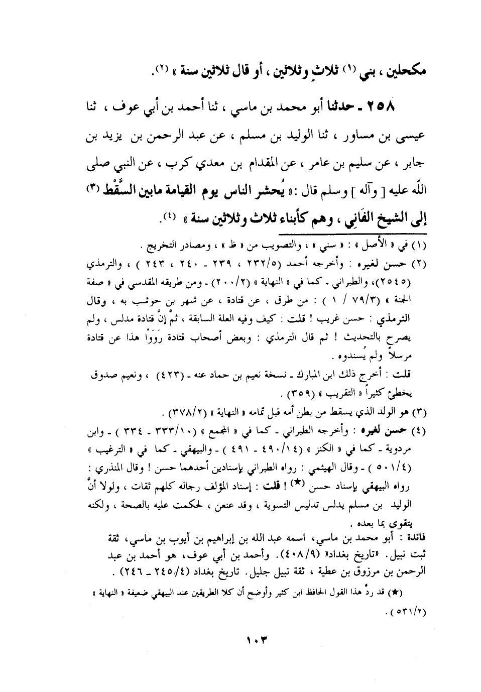 258 - حَدَّثَنَا أَبُو مُحَمَّدِ بْنُ مَاسِي، ثنا أَحْمَدُ بْنُ أَبِي عَوْفٍ، ثنا عِيسَى بْنُ مُسَاوِرٍ، ثنا الْوَلِيدُ بْنُ مُسْلِمٍ، عَنْ عَبْدِ الرَّحْمَنِ بْنِ يَزِيدَ بْنِ جَابِرٍ، عَنْ سُلَيْمِ بْنِ عَامِرٍ , عَنِ الْمِقْدَامِ بْنِ مَعْدِي كَرِبَ، عَنِ النَّبِيِّ صَلَّى اللَّهُ عَلَيْهِ وَآلِهِ وَسَلَّمَ قَالَ: §" يُحْشَرُ النَّاسُ يَوْمَ الْقِيَامَةِ مَا بَيْنَ السِّقْطِ إِلَى الشَّيْخِ الْفَانِي، وَهُمْ كَأَبْنَاءِ ثَلَاثٍ وَثَلَاثِينَ سَنَةً