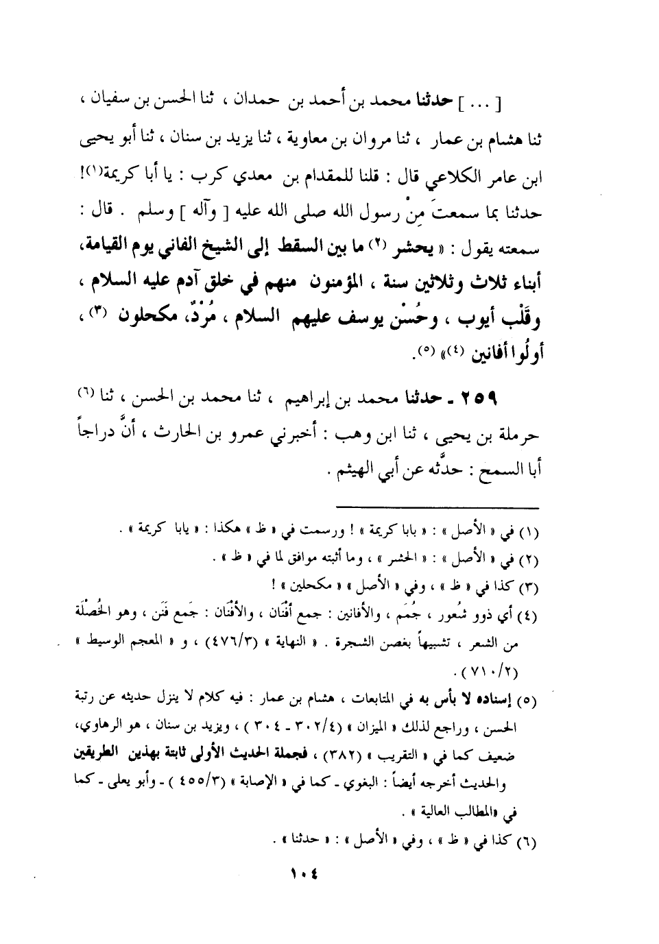 259 - حَدَّثَنَا مُحَمَّدُ بْنُ إِبْرَاهِيمَ، ثنا مُحَمَّدُ بْنُ الْحَسَنِ، ثنا حَرْمَلَةُ بْنُ يَحْيَى، ثنا ابْنُ وَهْبٍ، أَخْبَرَنِي عَمْرُو بْنُ الْحَارِثِ، أَنَّ دَرَّاجًا أَبَا السَّمْحِ، حَدَّثَهُ عَنْ أَبِي الْهَيْثَمِ، -[105]- ح، وَحَدَّثَنَا عَبْدُ اللَّهِ بْنُ مُحَمَّدِ بْنِ جَعْفَرٍ، ثنا مُحَمَّدُ بْنُ أَحْمَدَ بْنِ الْوَلِيدِ، ثنا يُونُسُ بْنُ عَبْدِ الْأَعْلَى، ثنا ابْنُ وَهْبٍ، أَخْبَرَنِي عَمْرُو بْنُ الْحَارِثِ، أَنَّ دَرَّاجًا أَبَا السَّمْحِ، حَدَّثَهُ، عَنْ أَبِي الْهَيْثَمِ , عَنْ أَبِي سَعِيدٍ، عَنْ رَسُولِ اللَّهِ صَلَّى اللَّهُ عَلَيْهِ وَآلِهِ وَسَلَّمَ قَالَ: §" مَنْ مَاتَ مِنْ أَهْلِ الْجَنَّةِ مِنْ صَغِيرٍ أَوْ كَبِيرٍ يُرَدُّونَ بَنِي ثَلَاثِينَ سَنَةً لَا يَزِيدُونَ عَلَيْهَا، وَكَذَلِكَ أَهْلُ النَّارِ -[106]-