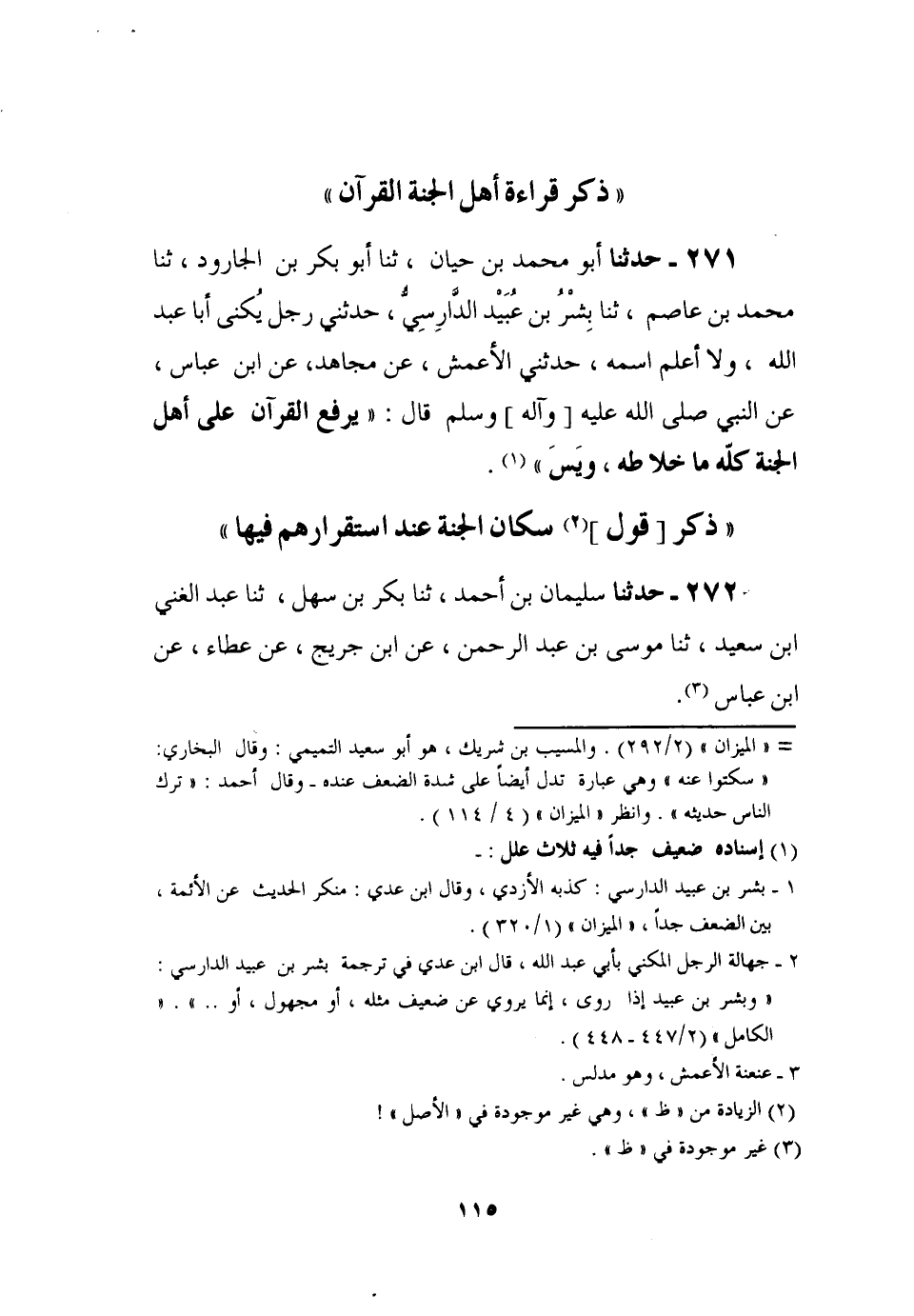 271 - حَدَّثَنَا أَبُو مُحَمَّدِ بْنُ حَيَّانَ، ثنا أَبُو بَكْرِ بْنُ الْجَارُودِ، ثنا مُحَمَّدُ بْنُ عَاصِمٍ، ثنا بِشْرُ بْنُ عُبَيْدٍ الدَّارِسِيُّ، حَدَّثَنِي رَجُلٌ يُكْنَى أَبَا عَبْدِ اللَّهِ، وَلَا أَعْلَمُ اسْمَهُ، حَدَّثَنِي الْأَعْمَشُ، عَنْ مُجَاهِدٍ , عَنِ ابْنِ عَبَّاسٍ، عَنِ النَّبِيِّ صَلَّى اللَّهُ عَلَيْهِ وَآلِهِ وَسَلَّمَ قَالَ: " §يُرْفَعُ الْقُرْآنُ عَلَى أَهْلِ الْجَنَّةِ كُلُّهُ مَا خَلَا طه، وَيس