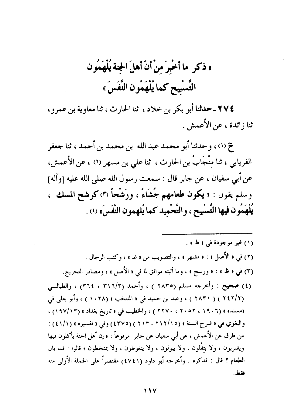 274 - حَدَّثَنَا أَبُو بَكْرِ بْنُ خَلَّادٍ، ثنا الْحَارِثُ، ثنا مُعَاوِيَةُ بْنُ عَمْرٍو، ثنا زَائِدَةُ، عَنِ الْأَعْمَشِ، ح، وَحَدَّثَنَا أَبُو مُحَمَّدٍ عَبْدُ اللَّهِ بْنُ مُحَمَّدِ بْنِ أَحْمَدَ، ثنا جَعْفَرٌ الْفِرْيَابِيُّ، ثنا مِنْجَابُ بْنُ الْحَارِثِ، ثنا عَلِيُّ بْنُ مُسْهِرٍ، عَنِ الْأَعْمَشِ، عَنْ أَبِي سُفْيَانَ , عَنْ جَابِرٍ، قَالَ: سَمِعْتُ رَسُولَ اللَّهِ صَلَّى اللَّهُ عَلَيْهِ وَآلِهِ وَسَلَّمَ يَقُولُ: يَكُونُ §طَعَامُهُمْ جُشَاءً، وَرَشْحًا كَرَشْحِ الْمِسْكِ، يُلْهَمُونَ فِيهَا التَّسْبِيحَ وَالتَّحْمِيدَ كَمَا يُلْهَمُونَ النَّفَسَ
