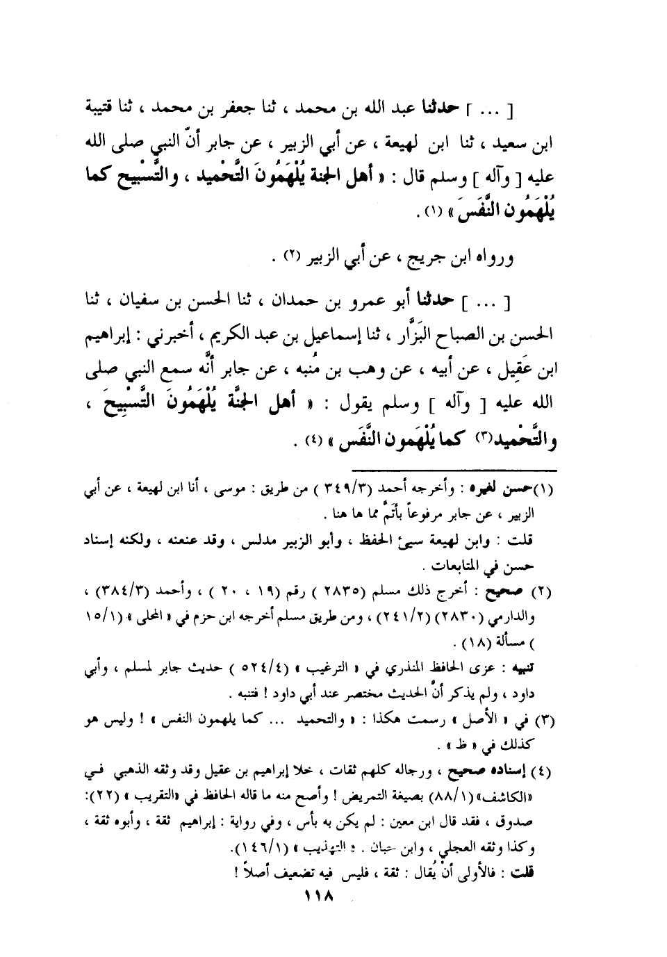 ( ... ) - حَدَّثَنَا عَبْدُ اللَّهِ بْنُ مُحَمَّدٍ، ثنا جَعْفَرُ بْنُ مُحَمَّدٍ، ثنا قُتَيْبَةُ بْنُ سَعِيدٍ، ثنا ابْنُ لَهِيعَةَ، عَنْ أَبِي الزُّبَيْرِ , عَنْ جَابِرٍ أَنَّ النَّبِيَّ صَلَّى اللَّهُ عَلَيْهِ وَآلِهِ وَسَلَّمَ قَالَ: " §أَهْلُ الْجَنَّةِ يُلْهَمُونَ التَّحْمِيدَ، وَالتَّسْبِيحَ كَمَا يُلْهَمُونَ النَّفْسَ وَرَوَاهُ ابْنُ جُرَيْجٍ، عَنْ أَبِي الزُّبَيْرِ