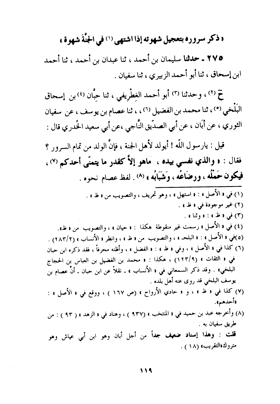 275 - حَدَّثَنَا سُلَيْمَانُ بْنُ أَحْمَدَ، ثنا عَبْدَانُ بْنُ أَحْمَدَ، ثنا أَحْمَدُ بْنُ إِسْحَاقَ، ثنا أَبُو أَحْمَدَ الزُّبَيْرِيُّ، ثنا سُفْيَانُ، ح، وَحَدَّثَنَا أَبُو أَحْمَدَ الْغِطْرِيفِيُّ، ثنا حَبَّانُ بْنُ إِسْحَاقَ الْبَلْخِيُّ، ثنا مُحَمَّدُ بْنُ الْفُضَيْلِ، ثنا عِصَامُ بْنُ يُوسُفَ، عَنْ سُفْيَانَ الثَّوْرِيِّ، عَنْ أَبَانَ، عَنْ أَبِي الصِّدِّيقِ النَّاجِيِّ , عَنْ أَبِي سَعِيدٍ الْخُدْرِيِّ، قَالَ: قِيلَ: يَا رَسُولَ اللَّهِ، أَيُولَدُ لِأَهْلِ الْجَنَّةِ، فَإِنَّ الْوَلَدَ مِنْ تَمَامِ السُّرُورِ؟ فَقَالَ: نَعَمْ، وَالَّذِي نَفْسِي بِيَدِهِ، §مَا هُوَ إِلَّا كَقَدْرِ مَا يَتَمَنَّى أَحَدُكُمْ، فَيَكُونُ حَمْلُهُ وَرَضَاعُهُ، وَشَبَابَهُ لَفْظُ عِصَامٍ نَحْوُهُ
