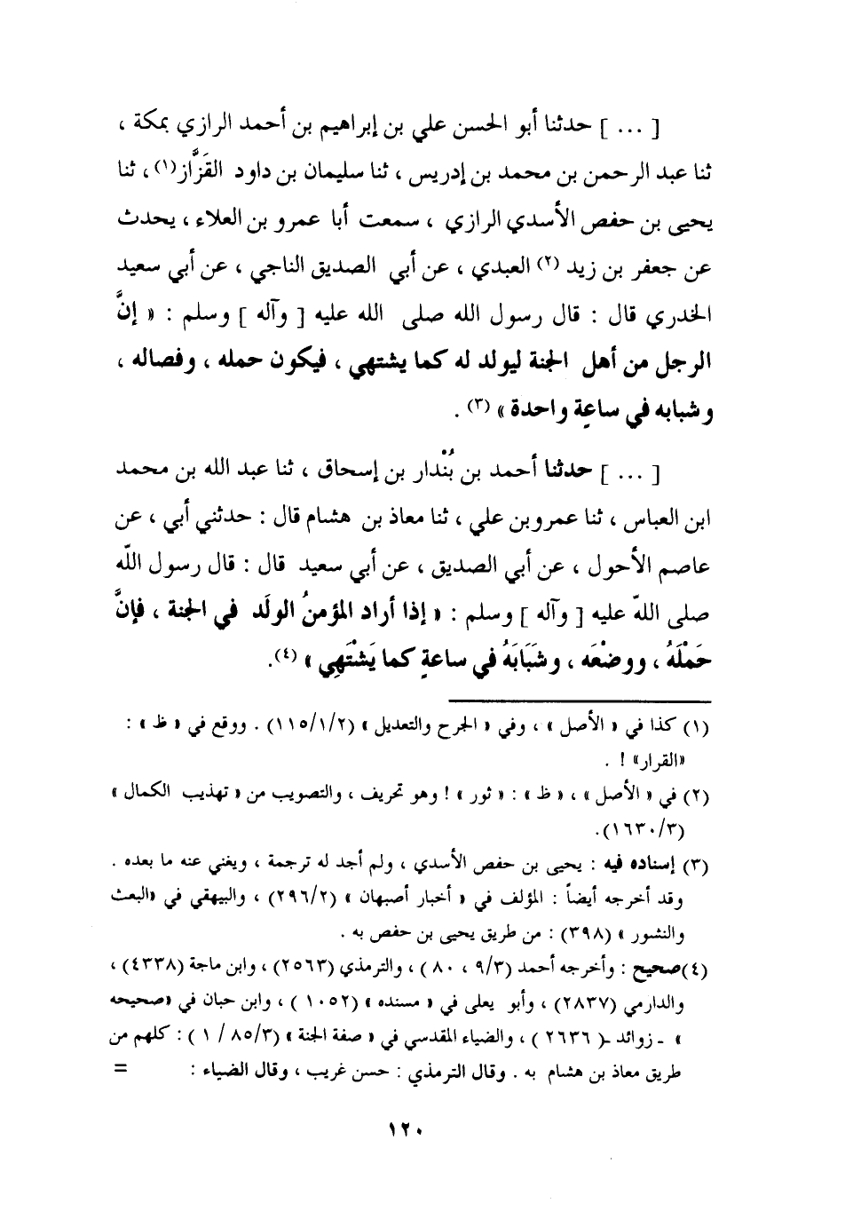 ( ... ) - حَدَّثَنَا أَبُو الْحَسَنِ عَلِيُّ بْنُ إِبْرَاهِيمَ عَنْ أَحْمَدَ الرَّازِيِّ بِمَكَّةَ، ثنا عَبْدُ الرَّحْمَنِ بْنُ مُحَمَّدِ بْنِ إِدْرِيسَ، ثنا سُلَيْمَانُ بْنُ دَاوُدَ الْقَزَّازُ، ثنا يَحْيَى بْنُ حَفْصٍ الْأَسَدِيُّ الرَّازِيُّ، سَمِعْتُ أَبَا عَمْرِو بْنَ الْعَلَاءِ، يُحَدِّثُ عَنْ جَعْفَرِ بْنِ زَيْدٍ الْعَبْدِيِّ، عَنْ أَبِي الصِّدِّيقِ النَّاجِيِّ , عَنْ أَبِي سَعِيدٍ الْخُدْرِيِّ، قَالَ: قَالَ رَسُولُ اللَّهِ صَلَّى اللَّهُ عَلَيْهِ وَآلِهِ وَسَلَّمَ: إِنَّ §الرَّجُلَ مِنْ أَهْلِ الْجَنَّةِ لَيُولَدُ لَهُ كَمَا يَشْتَهِي، فَيَكُونُ حَمْلُهُ وَفِصَالُهُ وَشَبَابُهُ فِي سَاعَةٍ وَاحِدَةٍ