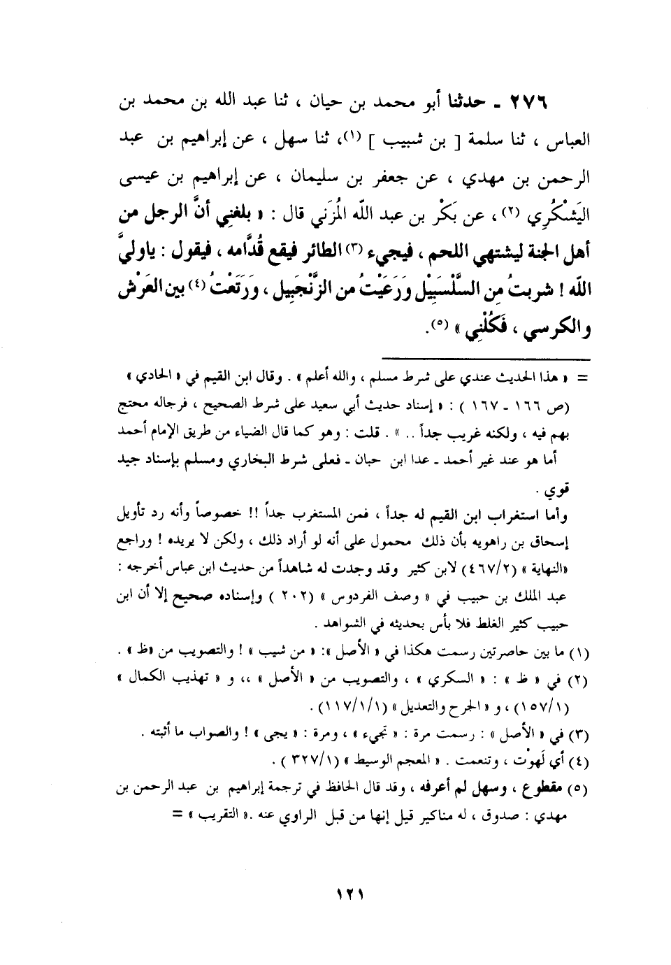 276 - حَدَّثَنَا أَبُو مُحَمَّدِ بْنُ حَيَّانَ، ثنا عَبْدُ اللَّهِ بْنُ مُحَمَّدِ بْنِ الْعَبَّاسِ، ثنا سَلَمَةُ بْنُ شَبِيبٍ، ثنا سَهْلٌ، عَنْ إِبْرَاهِيمَ بْنِ عَبْدِ الرَّحْمَنِ بْنِ مَهْدِيٍّ، عَنْ جَعْفَرِ بْنِ سُلَيْمَانَ، عَنْ إِبْرَاهِيمَ بْنِ عِيسَى الْيَشْكُرِيِّ , عَنْ بَكْرِ بْنِ عَبْدِ اللَّهِ الْمُزَنِيِّ، قَالَ: " بَلَغَنِي أَنَّ الرَّجُلَ مِنْ أَهْلِ الْجَنَّةِ §لَيَشْتَهِي اللَّحْمَ، فَيَجِيءُ الطَّائِرُ فَيَقَعُ قُدَّامَهُ، فَيَقُولُ: يَا وَلِيَّ اللَّهِ، شَرِبْتَ مِنَ السَّلْسَبِيلِ، وَرُعِيتَ مِنَ الزَّنْجَبِيلِ، وَرَتَعْتُ بَيْنَ الْعَرْشِ وَالْكُرْسِيِّ فَكُلْنِي