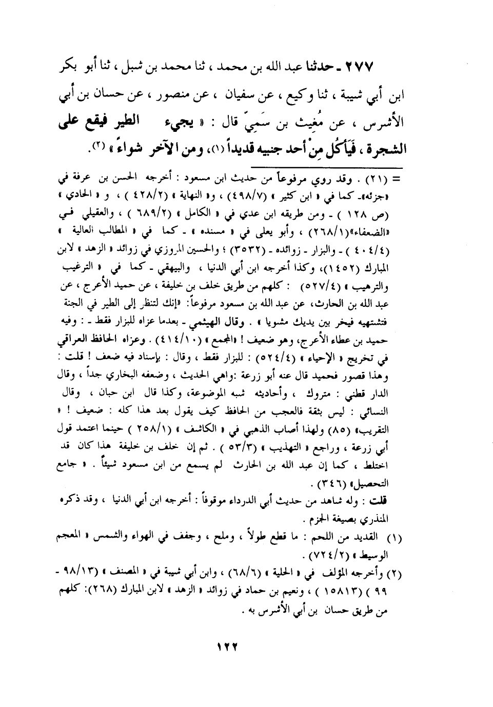 277 - حَدَّثَنَا عَبْدُ اللَّهِ بْنُ مُحَمَّدٍ، ثنا مُحَمَّدُ بْنُ شِبْلٍ، ثنا أَبُو بَكْرِ بْنُ أَبِي شَيْبَةَ، ثنا وَكِيعٌ، عَنْ سُفْيَانَ، عَنْ مَنْصُورٍ، عَنْ حَسَّانَ بْنِ أَبِي الْأَشْرَسِ , عَنْ مُغِيثِ بْنِ سُمَيٍّ، قَالَ: " §يَجِيءُ الطَّيْرُ فَيَقَعُ عَلَى الشَّجَرَةِ، فَيَأْكُلُ مِنْ أَحَدٍ جَنْبَيْهِ قُدَيْدًا، وَمِنَ الْآخَرِ شِوَاءً