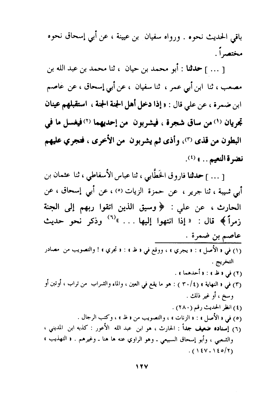 ( ... ) - حَدَّثَنَا أَبُو مُحَمَّدِ بْنُ حَيَّانَ، ثنا مُحَمَّدُ بْنُ عَبْدِ اللَّهِ بْنِ مُصْعَبٍ، ثنا ابْنُ أَبِي عُمَرَ، ثنا سُفْيَانُ، عَنْ أَبِي إِسْحَاقَ، عَنْ عَاصِمِ بْنِ ضَمْرَةَ، عَنْ عَلِيٍّ قَالَ: " §إِذَا دَخَلَ أَهْلُ الْجَنَّةِ الْجَنَّةَ، اسْتَقْبَلَهُمْ عَيْنَانِ تَجْرِيَانِ مِنْ سَاقٍ شَجَرَةٍ، فَيَشْرَبُونَ مِنْ إِحْدَيْهِمَا فَيَغْسِلُ مَا فِي الْبُطُونِ مِنْ قَذًى، وَأَذًى ثُمَّ يَشْرَبُونَ مِنَ الْأُخْرَى فَتَجْرِي عَلَيْهِمْ نَضْرَةُ النَّعِيمِ