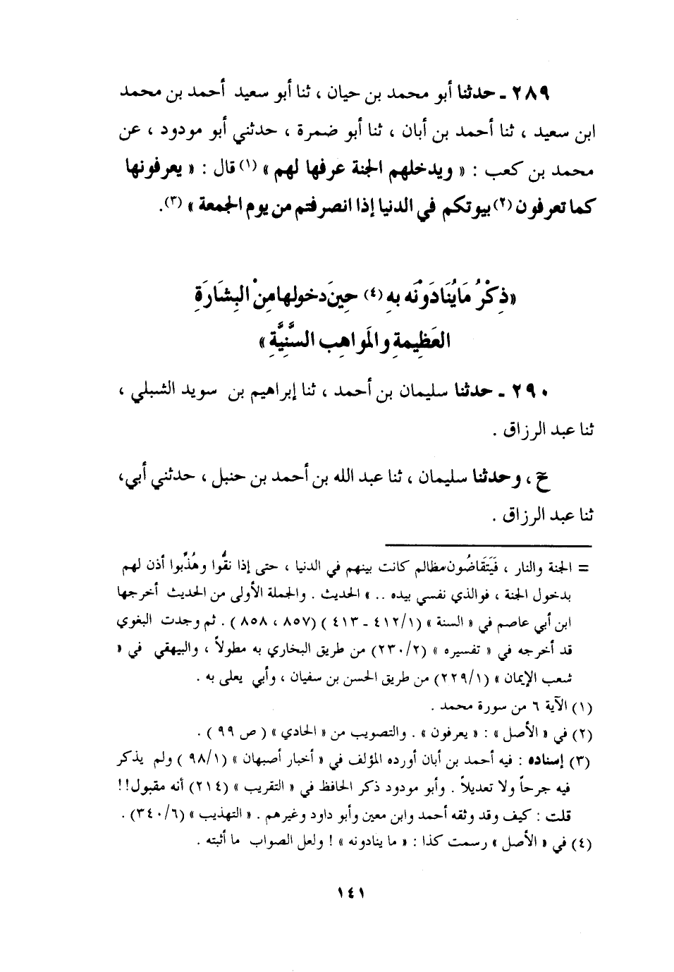 289 - حَدَّثَنَا أَبُو مُحَمَّدِ بْنُ حَيَّانَ، ثنا أَبُو سَعِيدٍ أَحْمَدُ بْنُ مُحَمَّدِ بْنِ سَعِيدٍ، ثنا أَحْمَدُ بْنُ أَبَانَ، ثنا أَبُو ضَمْرَةَ، حَدَّثَنِي أَبُو مَوْدُودٍ , عَنْ مُحَمَّدِ بْنِ كَعْبٍ، {وَيُدْخِلُهُمُ الْجَنَّةَ عَرِّفْهَا لَهُمْ} [محمد: 6] قَالَ: §" يَعْرِفُونَهَا كَمَا تَعْرِفُونَ بُيُوتَكُمْ فِي الدُّنْيَا إِذَا انْصَرَفْتُمْ مِنْ يَوْمِ الْجُمُعَةِ