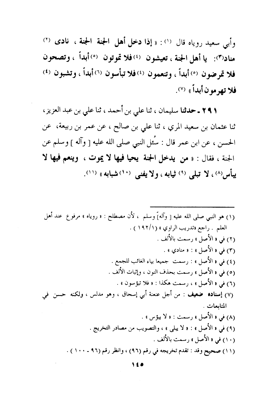 291 - حَدَّثَنَا سُلَيْمَانُ بْنُ أَحْمَدَ، ثنا عَلِيُّ بْنُ عَبْدِ الْعَزِيزِ، ثنا عُثْمَانُ بْنُ سَعِيدٍ الْمُرِّيُّ، ثنا عَلِيُّ بْنُ صَالِحٍ، عَنْ عُمَرَ بْنِ رَبِيعَةَ، عَنِ الْحَسَنِ , عَنِ ابْنِ عُمَرَ، قَالَ: سُئِلَ النَّبِيُّ صَلَّى اللَّهُ عَلَيْهِ وَآلِهِ وَسَلَّمَ عَنِ الْجَنَّةَ فَقَالَ: " §مَنْ يَدْخُلِ الْجَنَّةَ يَحْيَا فِيهَا لَا يَمُوتُ، وَيَنْعَمُ فِيهَا لَا يَبْأَسُ، لَا تَبْلَى ثِيَابُهُ، وَلَا يَفْنَى شَبَابُهُ