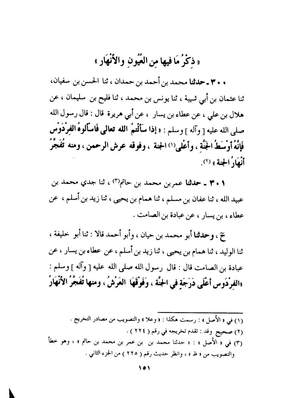 301 - حَدَّثَنَا عُمَرُ بْنُ مُحَمَّدِ بْنِ حَاتِمٍ، ثنا جَدِّي مُحَمَّدُ بْنُ عُبَيْدِ اللَّهِ، ثنا عَفَّانُ بْنُ مُسْلِمٍ، ثنا هَمَّامُ بْنُ يَحْيَى، ثنا زَيْدُ بْنُ أَسْلَمَ، عَنْ عَطَاءِ بْنِ يَسَارٍ، عَنْ عُبَادَةَ بْنِ الصَّامِتِ، ح، وَحَدَّثَنَا أَبُو مُحَمَّدِ بْنُ حَيَّانَ، وَأَبُو أَحْمَدَ قَالَا: ثنا أَبُو خَلِيفَةَ، ثنا أَبُو الْوَلِيدِ، ثنا هَمَّامُ بْنُ يَحْيَى، ثنا زَيْدُ بْنُ أَسْلَمَ، عَنْ عَطَاءِ بْنِ يَسَارٍ , عَنْ عُبَادَةَ بْنِ الصَّامِتِ، قَالَ: قَالَ رَسُولُ اللَّهِ صَلَّى اللَّهُ عَلَيْهِ وَآلِهِ وَسَلَّمَ:، §الْفِرْدَوْسُ أَعْلَى دَرَجَةٍ فِي الْجَنَّةِ، وَفَوْقَهَا الْعَرْشُ، وَمِنْهَا تَفَجَّرُ الْأَنْهَارُ -[152]- الْأَرْبَعَةُ