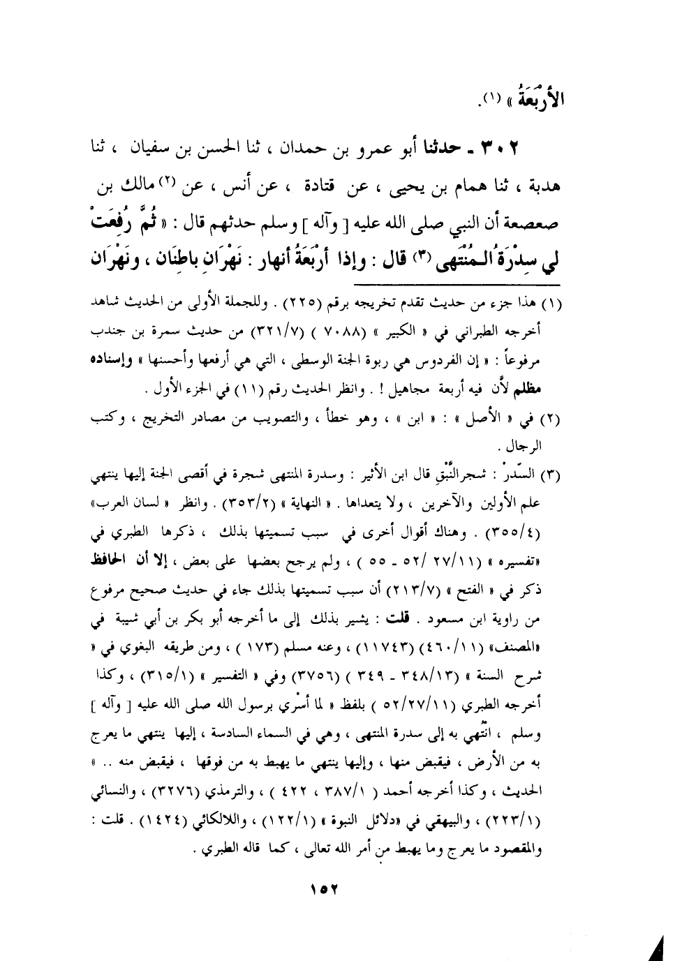 302 - حَدَّثَنَا أَبُو عَمْرِو بْنُ حَمْدَانَ، ثنا الْحَسَنُ بْنُ سُفْيَانَ، ثنا هُدْبَةُ، ثنا هَمَّامُ بْنُ يَحْيَى، عَنْ قَتَادَةَ، عَنْ أَنَسٍ , عَنْ مَالِكِ بْنِ صَعْصَعَةَ، أَنَّ نَبِيَّ اللَّهِ صَلَّى اللَّهُ عَلَيْهِ وَآلِهِ وَسَلَّمَ حَدَّثَهُمْ قَالَ: ثُمَّ §رُفِعَتْ لِي سِدْرَةُ الْمُنْتَهَى قَالَ: وَإِذَا أَرْبَعَةُ أَنْهَارٍ: نَهْرَانِ بَاطِنَانِ، وَنَهْرَانِ -[153]- ظَاهِرَانِ، فَقُلْتُ: مَا هَذَا يَا جِبْرِيلُ؟ قَالَ: أَمَا الْبَاطِنَانِ: فَنَهَرَانِ فِي الْجَنَّةِ، وَأَمَّا الظَّاهِرَانِ: فَالنِّيلُ وَالْفُرَاتُ