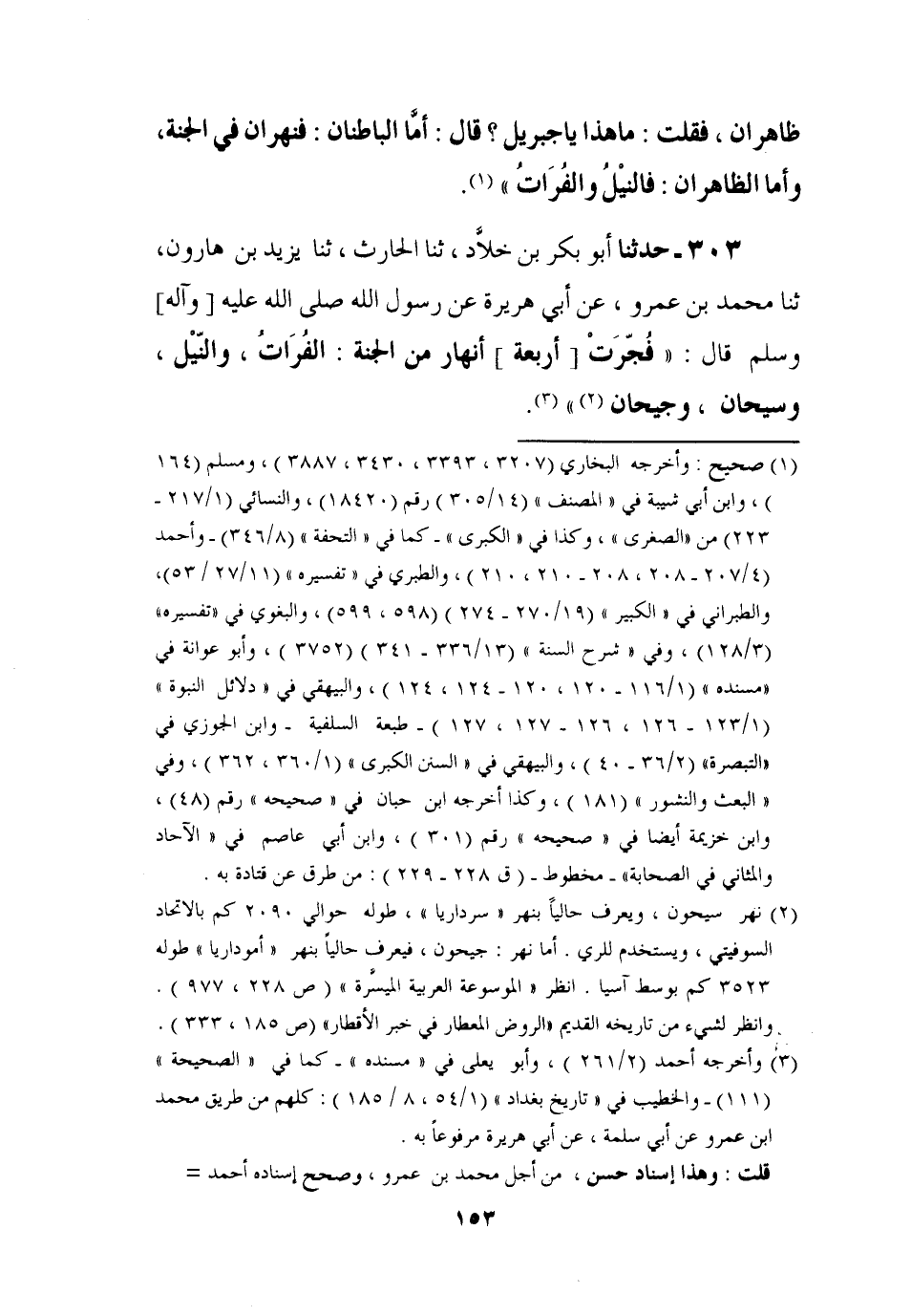 303 - حَدَّثَنَا أَبُو بَكْرِ بْنُ خَلَّادٍ، ثنا الْحَارِثُ، ثنا يَزِيدُ بْنُ هَارُونَ، ثنا مُحَمَّدُ بْنُ عَمْرٍو , عَنْ أَبِي هُرَيْرَةَ، عَنْ رَسُولِ اللَّهِ صَلَّى اللَّهُ عَلَيْهِ وَآلِهِ وَسَلَّمَ قَالَ: " §فُجِّرَتْ أَرْبَعَةُ أَنْهَارٍ مِنَ الْجَنَّةِ: الْفُرَاتُ، وَالنِّيلُ، وَسَيْحَانُ، وَجَيْحَانُ