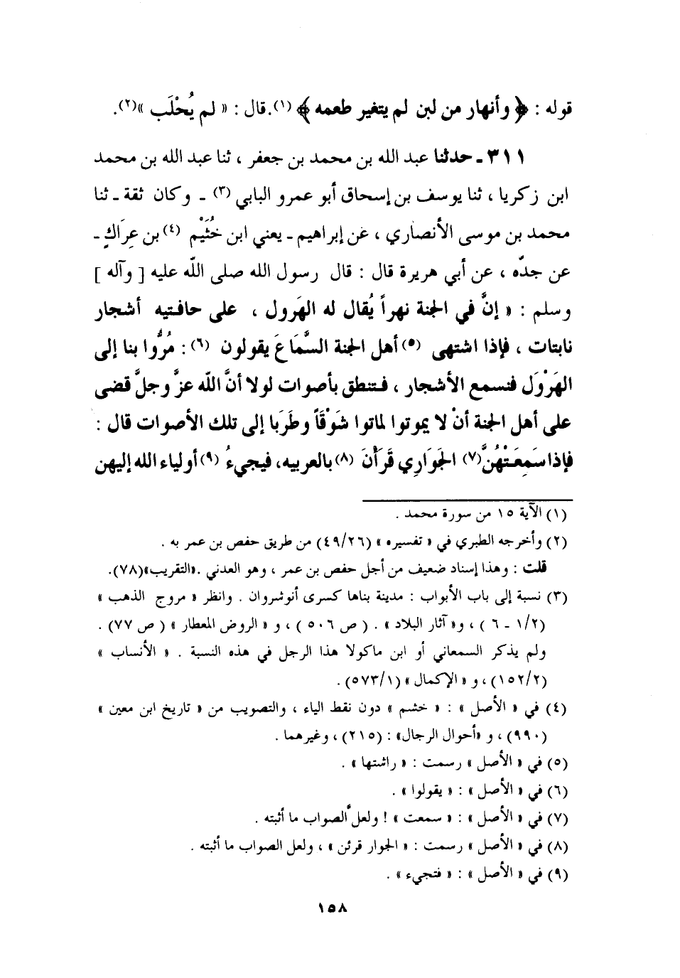 311 - حَدَّثَنَا عَبْدُ اللَّهِ بْنُ مُحَمَّدِ بْنِ جَعْفَرٍ، ثنا عَبْدُ اللَّهِ بْنُ مُحَمَّدِ بْنِ زَكَرِيَّا، ثنا يُوسُفُ بْنُ إِسْحَاقَ أَبُو عَمْرٍو الْبَابِيُّ، وَكَانَ ثِقَةً، ثنا مُحَمَّدُ بْنُ مُوسَى الْأَنْصَارِيُّ، عَنْ إِبْرَاهِيمَ يَعْنِي ابْنُ خُثَيْمِ بْنِ عِرَاكٍ، عَنْ جَدِّهِ , عَنْ أَبِي هُرَيْرَةَ، قَالَ: قَالَ رَسُولُ اللَّهِ صَلَّى اللَّهُ عَلَيْهِ وَآلِهِ وَسَلَّمَ: إِنَّ §فِي الْجَنَّةِ نَهْرًا يُقَالُ لَهُ: الْهَرْوَلُ، عَلَى حَافَتَيْهِ أَشْجَارٌ نَابِتَاتٌ، فَإِذَا اشْتَهَى أَهْلُ الْجَنَّةِ السَّمَاعَ يَقُولُونَ: مُرُّوا بِنَا إِلَى الْهَرْوَلِ فَنَسْمَعُ الْأَشْجَارَ، فَتَنْطِقُ بِأَصْوَاتٍ لَوْلَا أَنَّ اللَّهَ عَزَّ وَجَلَّ قَضَى عَلَى أَهْلِ الْجَنَّةِ أَنْ لَا يَمُوتُوا لَمَاتُوا شَوْقٌا وَطَرَبًا إِلَى تِلْكَ الْأَصْوَاتِ قَالَ: فَإِذَا سَمِعَتْهُنَّ الْجَوَارِي قَرَأْنَ بِالْعَرَبِيَّةِ، فَيَجِيءُ أَوْلِيَاءُ اللَّهِ إِلَيْهِنَّ، -[159]- فَيَقْطِفُ كُلُّ وَاحِدٍ مِنْهُنَّ مَا اشْتَهَى ثُمَّ يُعِيدُ اللَّهُ تَعَالَى مَكَانَهُنَّ مِثْلَهُنَّ