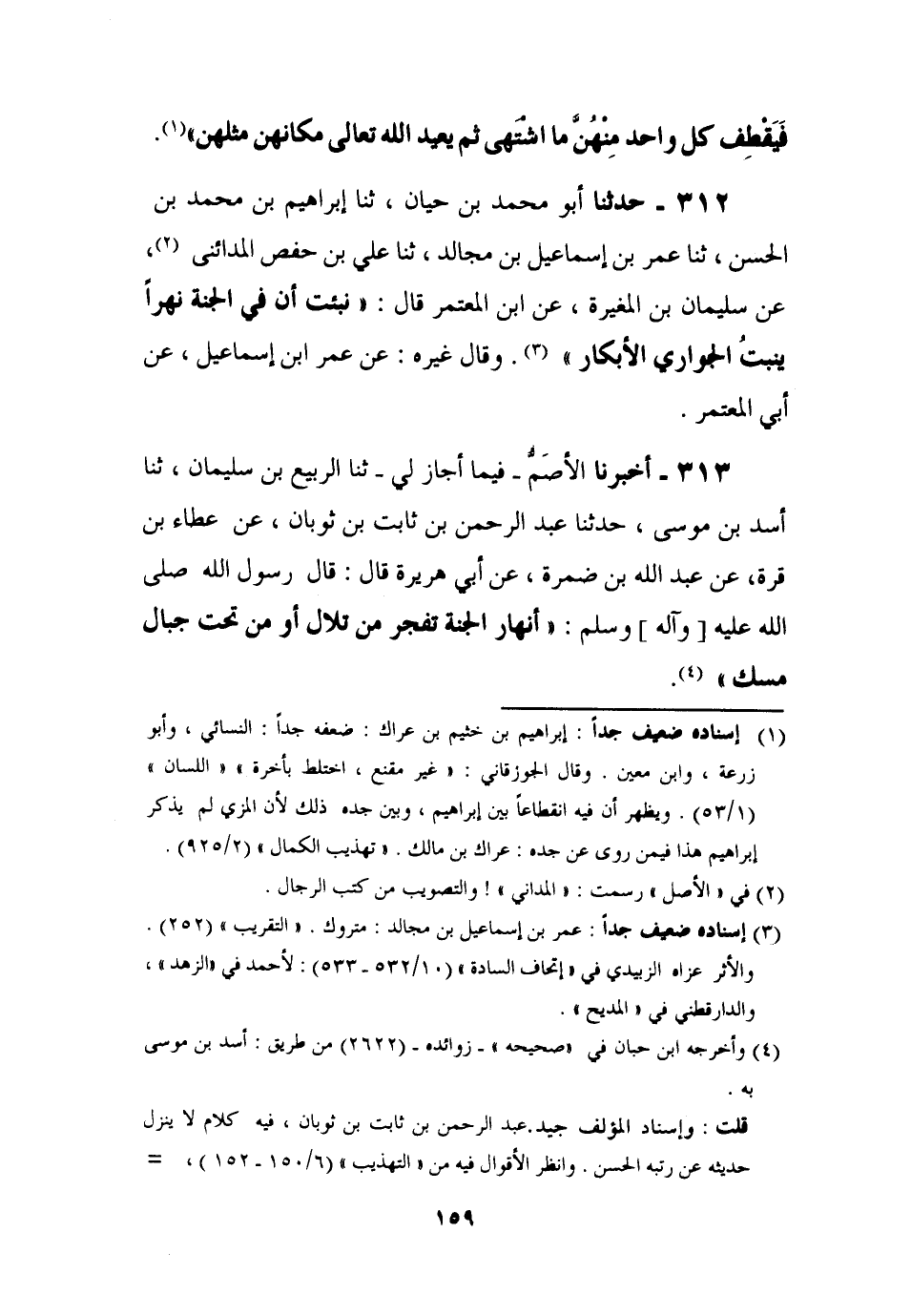 312 - حَدَّثَنَا أَبُو مُحَمَّدِ بْنُ حَيَّانَ، ثنا إِبْرَاهِيمُ بْنُ مُحَمَّدِ بْنِ الْحَسَنِ، ثنا عُمَرُ بْنُ إِسْمَاعِيلَ بْنِ مُجَالِدٍ، ثنا عَلِيُّ بْنُ حَفْصٍ الْمَدَائِنِيُّ، عَنْ سُلَيْمَانَ بْنِ الْمُغِيرَةِ , عَنِ ابْنِ الْمُعْتَمِرِ، قَالَ: نُبِّئْتُ أَنَّ §فِيَ الْجَنَّةِ نَهْرًا يُنْبِتُ الْجَوَارِي الْأَبْكَارَ وَقَالَ غَيْرُهُ: عَنْ عُمَرَ بْنِ إِسْمَاعِيلَ، عَنْ أَبِي الْمُعْتَمِرِ