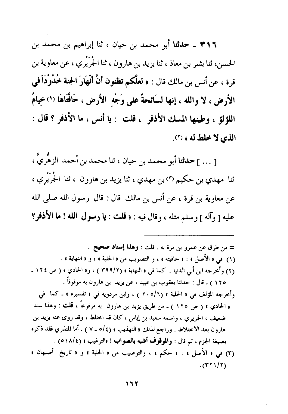 316 - حَدَّثَنَا أَبُو مُحَمَّدِ بْنُ حَيَّانَ، ثنا إِبْرَاهِيمُ بْنُ مُحَمَّدِ بْنِ الْحَسَنِ، ثنا بِشْرُ بْنُ مُعَاذٍ، ثنا يَزِيدُ بْنُ هَارُونَ، ثنا الْجُرَيْرِيُّ، عَنْ مُعَاوِيَةَ بْنِ قُرَّةَ , عَنْ أَنَسِ بْنِ مَالِكٍ، قَالَ: " §لَعَلَّكُمْ تَظُنُّونَ أَنَّ أَنْهَارَ الْجَنَّةِ خُدُودٌ فِي الْأَرْضِ، لَا وَاللَّهِ، إِنَّهَا لَسَائِحَةُ عَلَى وَجْهِ الْأَرْضِ، حَافَّتَاهَا خِيَامُ اللُّؤْلُؤِ، وَطِينُهَا الْمِسْكُ الْأَذْفَرُ، قُلْتُ: يَا أَنَسُ، مَا الْأَذْفَرُ؟ قَالَ: الَّذِي لَا خِلْطَ لَهُ