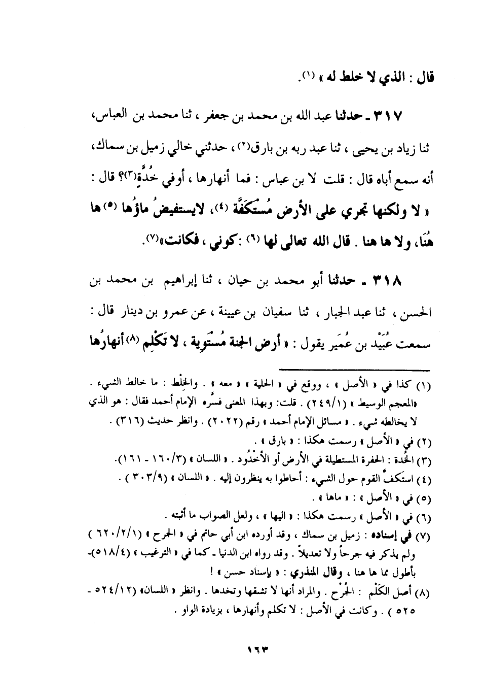 317 - حَدَّثَنَا عَبْدُ اللَّهِ بْنُ مُحَمَّدِ بْنِ جَعْفَرٍ، ثنا مُحَمَّدُ بْنُ الْعَبَّاسِ، ثنا زِيَادُ بْنُ يَحْيَى، ثنا عَبْدُ رَبِّهِ بْنُ بَارِقٍ، حَدَّثَنِي خَالِي زُمَيْلِ بْنُ سِمَاكٍ، أَنَّهُ سَمِعَ أَبَاهُ، قَالَ: قُلْتُ لِابْنِ عَبَّاسٍ:، §فَمَا أَنْهَارُهَا، أَوَفِي خَدِّهِ؟ قَالَ: لَا، وَلَكِنَّهَا تَجْرِي عَلَى الْأَرْضِ مُسْتَكِفَّةً، لَا يَسْتَفِيضُ مَاؤُهَا هَاهُنَا، وَلَا هَاهُنَا. قَالَ اللَّهُ تَعَالَى لَهَا: كُونِي فَكَانَتْ