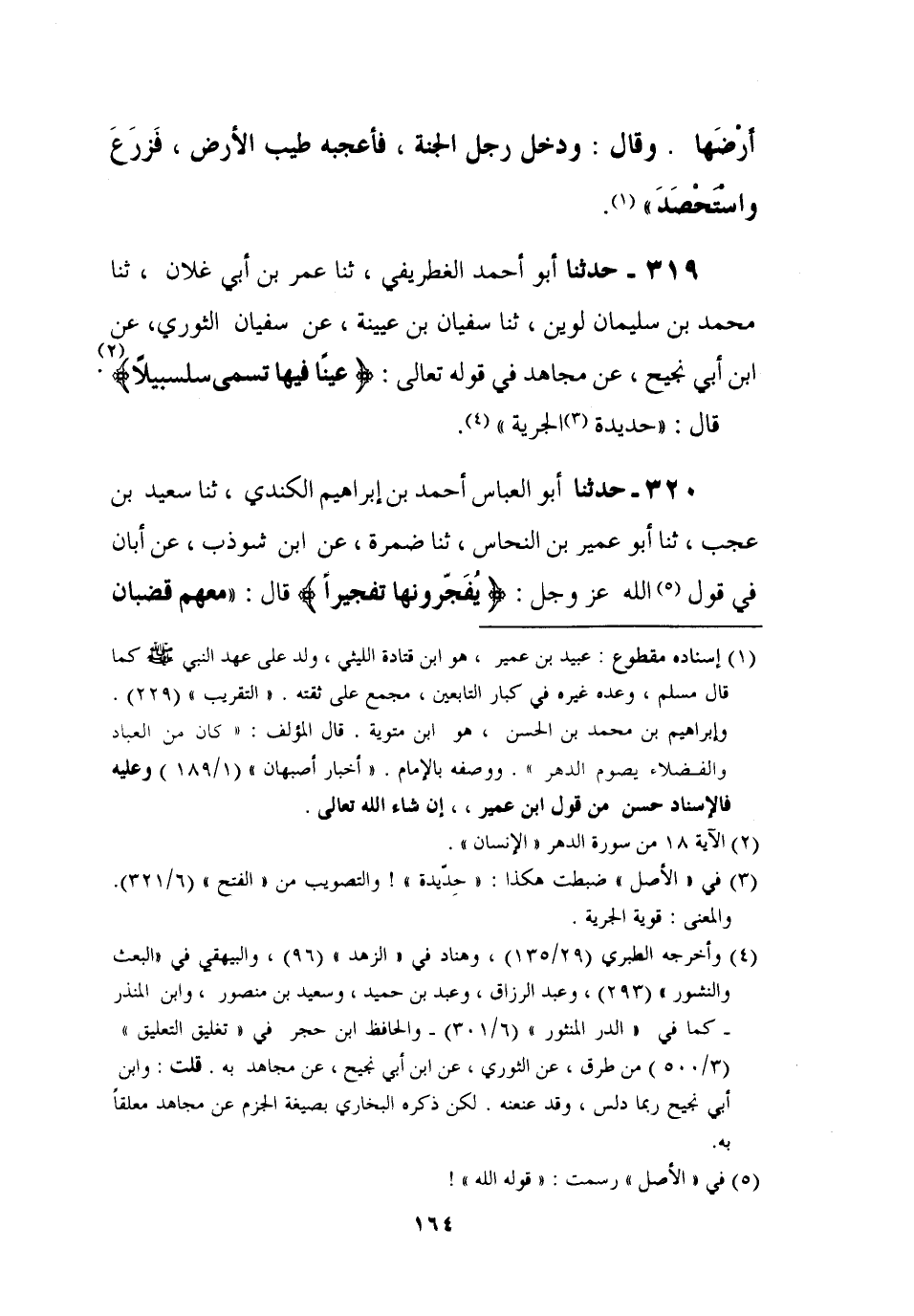 319 - حَدَّثَنَا أَبُو أَحْمَدَ الْغِطْرِيفِيُّ، ثنا عُمَرُ بْنُ أَبِي غِلَانَ، ثنا مُحَمَّدُ بْنُ سُلَيْمَانَ لُوَيْنٌ، ثنا سُفْيَانُ بْنُ عُيَيْنَةَ، عَنْ سُفْيَانَ الثَّوْرِيِّ، عَنِ ابْنِ أَبِي نَجِيحٍ , عَنْ مُجَاهِدٍ، فِي قَوْلِهِ تَعَالَى {عَيْنًا فِيهَا تُسَمَّى سَلْسَبِيلًا} [الإنسان: 18] قَالَ: §" حَدِيدَةُ الْجِرْيَةِ